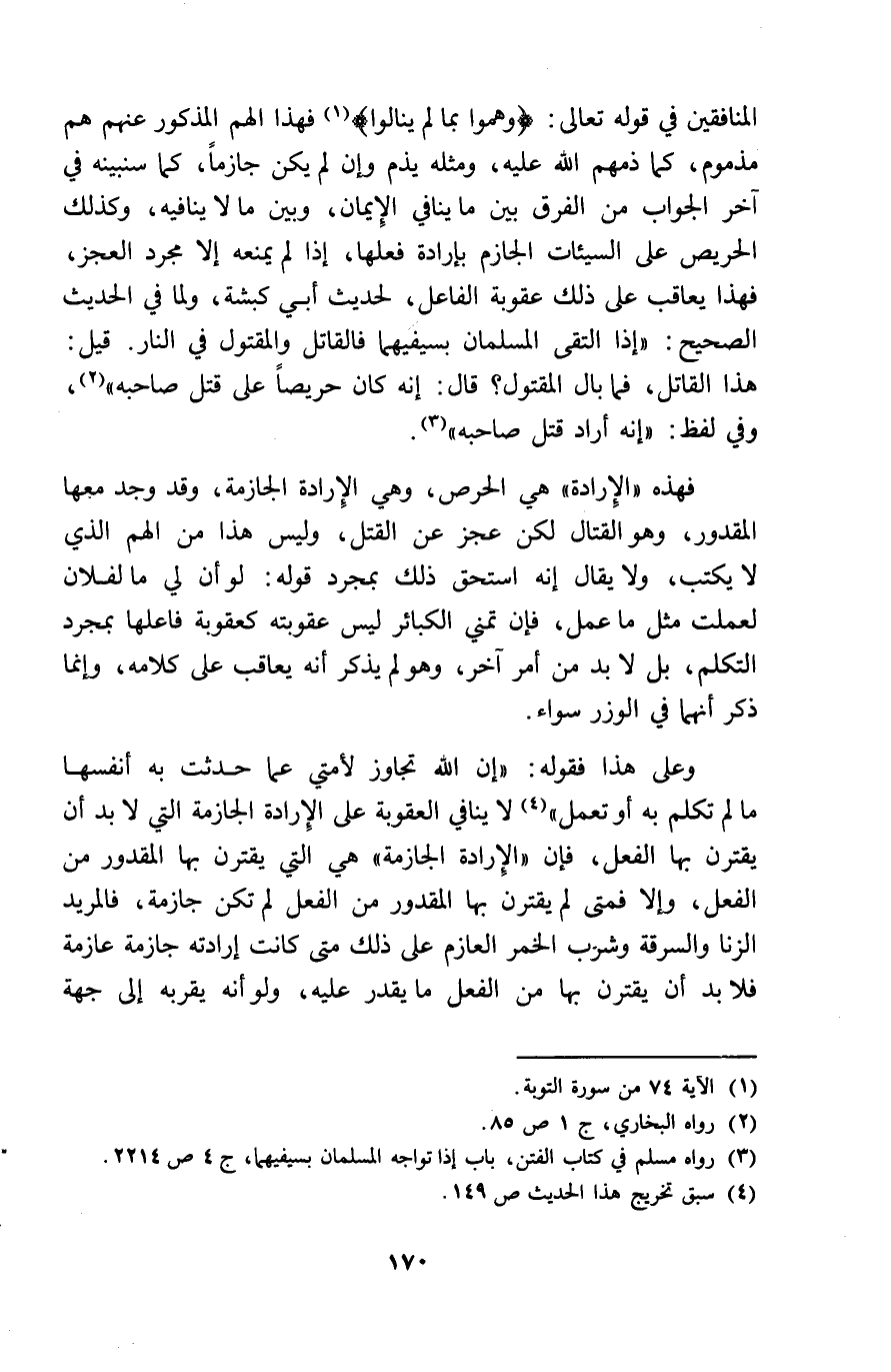 الْمُنَافِقين فِي قَوْله تَعَالَى وهموا بِمَا لم ينالوافهذا الْهم الْمَذْكُور عَنْهُم هم مَذْمُوم كَمَا ذمهم الله عَلَيْهِ وَمثله يذم وان لم يكن جَازِمًا كَمَا سنبينه فِي آخر الْجَواب من الْفرق بَين مَا يُنَافِي الايمان وَبَين مَا لَا يُنَافِيهِ وَكَذَلِكَ الْحَرِيص على السَّيِّئَات الْجَازِم بارادة فعلهَا اذا لم يمنعهُ الا مُجَرّد الْعَجز فَهَذَا يُعَاقب على ذَلِك عُقُوبَة الْفَاعِل لحَدِيث أبي كَبْشَة وَلما فِي الحَدِيث الصَّحِيح اذا التفى المسلمان بسيفيهما فالقاتل والمقتول فِي النَّار قيل هَذَا الْقَاتِل فَمَا بَال الْمَقْتُول قَالَ انه كَانَ حَرِيصًا على قتل صَاحبه وَفِي لفظ انه أَرَادَ قتل صَاحبه فَهَذِهِ الارادة هِيَ الْحِرْص وَهِي الارادة الجازمة وَقد وجد مَعهَا الْمَقْدُور وَهُوَ الْقِتَال لَكِن عجز عَن الْقَتْل وَلَيْسَ هَذَا من الْهم الَّذِي لَا يكْتب وَلَا يُقَال انه اسْتحق ذَلِك بِمُجَرَّد قَوْله لَو أَن لي مَا لفُلَان لعملت مثل مَا عمل فَإِن تمني الْكَبَائِر لَيْسَ عُقُوبَته كعقوبة فاعلها بِمُجَرَّد التَّكَلُّم بل لَا بُد من أَمر آخر وَهُوَ لم يذكر أَنه يُعَاقب على كَلَامه وانما ذكر أَنَّهُمَا فِي الْوزر سَوَاء وعَلى هَذَا فَقَوله ان الله تجَاوز لأمتي عَمَّا حدثت بِهِ أَنْفسهَا مَا لم تكلم بِهِ أَو تعْمل لَا يُنَافِي الْعقُوبَة على الارادة الجازمة الَّتِي لَا بُد أَن يقْتَرن بهَا الْفِعْل فان الارادة الجازمة هِيَ الَّتِي يقْتَرن بهَا الْمَقْدُور من الْفِعْل والا فَمَتَى لم يقْتَرن بهَا الْمَقْدُور من الْفِعْل لم تكن جازمة فالمريد الزِّنَا وَالسَّرِقَة وَشرب الْخمر العازم على ذَلِك مَتى كَانَت ارادته جازمة عازمة فَلَا بُد أَن يقْتَرن بهَا من الْفِعْل مَا يقدر عَلَيْهِ وَلَو أَنه يقربهُ الى جِهَة