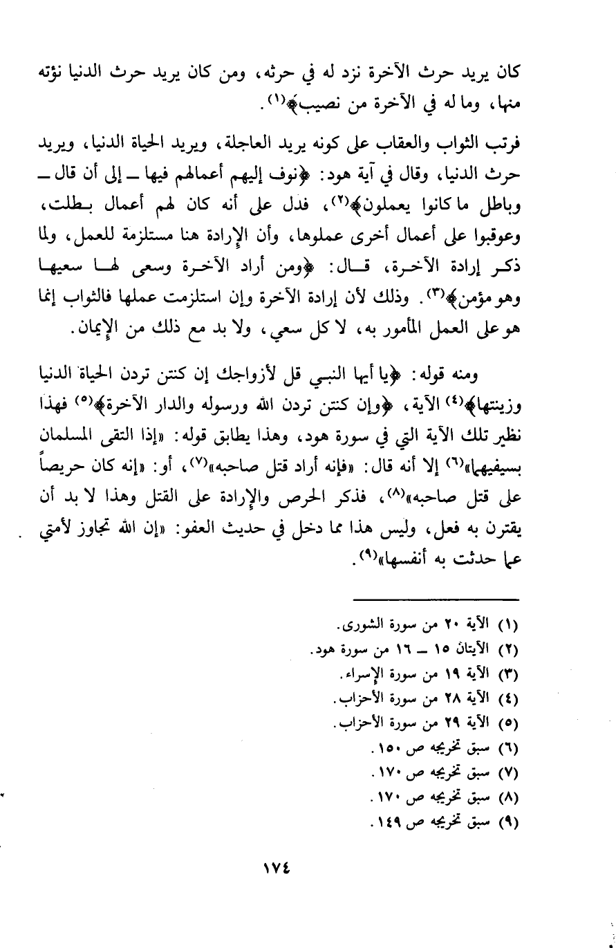 كَانَ يُرِيد حرث الْآخِرَة نزد لَهُ فِي حرثه وَمن كَانَ يُرِيد حرث الدُّنْيَا نؤته مِنْهَا وَمَا لَهُ فِي الْآخِرَة من نصيب فرتب الثَّوَاب وَالْعِقَاب على كَونه يُرِيد العاجلة وَيُرِيد الْحَيَاة الدُّنْيَا وَيُرِيد حرث الدُّنْيَا وَقَالَ فِي آيَة هود نوف اليهم أَعْمَالهم فِيهَا الى أَن قَالَ وباطل مَا كَانُوا يعْملُونَ فَدلَّ على أَنه كَانَ لَهُم أَعمال بطلت وعوقبوا على أَعمال أُخْرَى عملوها وَأَن الارادة هُنَا مستلزمة للْعَمَل وَلما ذكر ارادة الْآخِرَة قَالَ وَمن أَرَادَ الْآخِرَة وسعى لَهَا سعيها وَهُوَ مُؤمن وَذَلِكَ لِأَن ارادة الْآخِرَة وان استلزمت عَملهَا فالثواب انما هُوَ على الْعَمَل الْمَأْمُور بِهِ لَا كل سعي وَلَا بُد مَعَ ذَلِك من الايمان وَمِنْه قَوْله يَا أَيهَا النَّبِي قل لِأَزْوَاجِك ان كنتن تردن الْحَيَاة الدُّنْيَا وَزينتهَا الْآيَة وان كنتن تردن الله وَرَسُوله وَالدَّار الْآخِرَة فَهَذَا نَظِير تِلْكَ الْآيَة الَّتِي فِي سُورَة هود وَهَذَا يُطَابق قَوْله اذا التقى المسلمان بسيفيهما الا أَنه قَالَ فانه أَرَادَ قتل صَاحبه أَو انه كَانَ حَرِيصًا على قتل صَاحبه فَذكر الْحِرْص والارادة على الْقَتْل وَهَذَا لَا بُد أَن يقْتَرن بِهِ فعل وَلَيْسَ هَذَا مِمَّا دخل فِي حَدِيث الْعَفو ان الله تجَاوز لأمتي عَمَّا حدثت بِهِ أَنْفسهَا