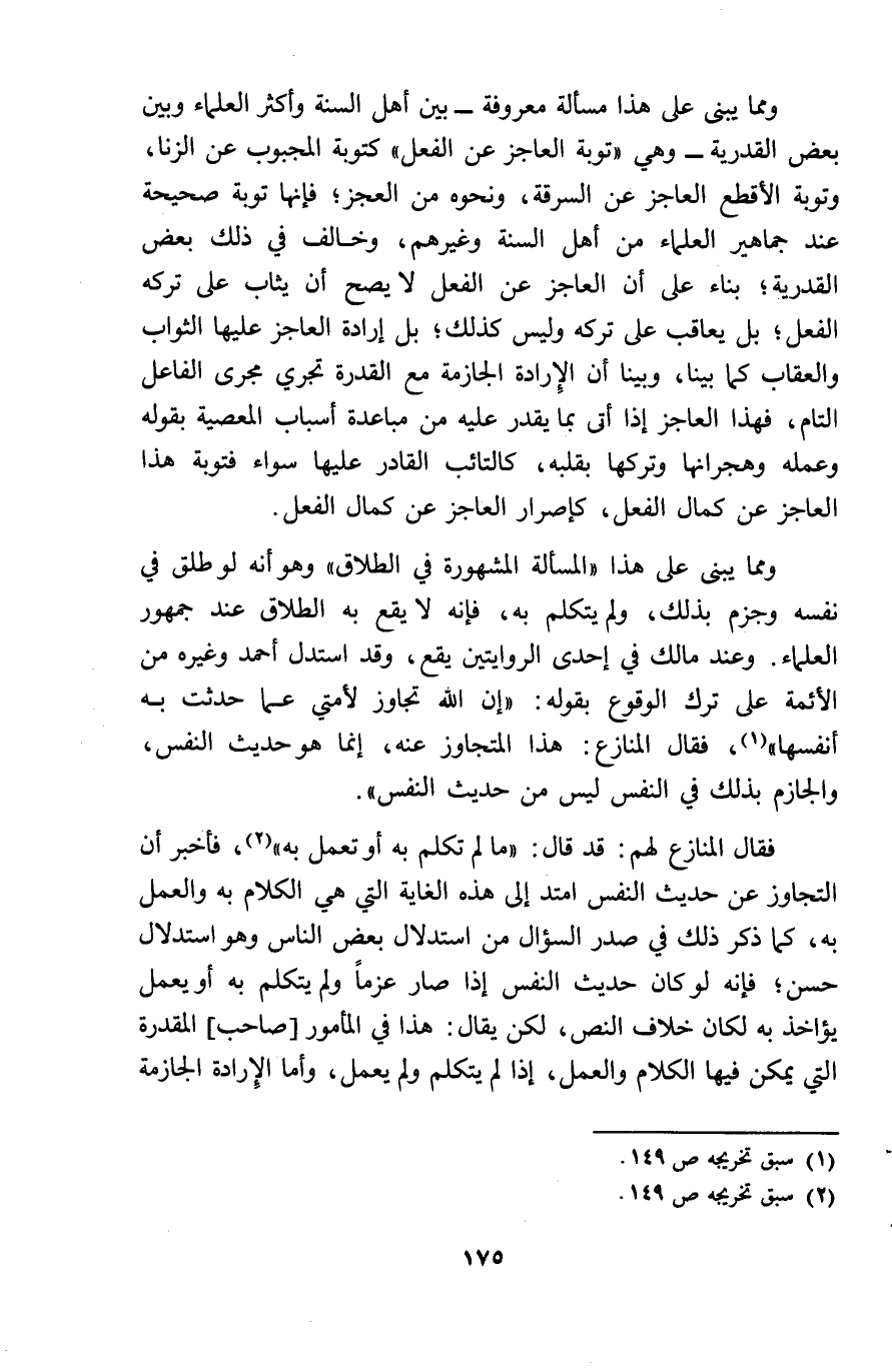 وَمِمَّا يبْنى على هَذَا مَسْأَلَة مَعْرُوفَة بَين أهل السّنة وَأكْثر الْعلمَاء وَبَين بعض القدريه وَهِي تَوْبَة الْعَاجِز عَن الْفِعْل كتوبة الْمَجْبُوب عَن الزِّنَا وتوبة الأقطع الْعَاجِز عَن السّرقَة وَنَحْوه من الْعَجز فانها تَوْبَة صَحِيحَة عِنْد جَمَاهِير الْعلمَاء من أهل السّنة وَغَيرهم وَخَالف فِي ذَلِك بعض الْقَدَرِيَّة بِنَاء على أَن الْعَاجِز عَن الْفِعْل لَا يَصح أَن يُثَاب على تَركه الْفِعْل بل يُعَاقب على تَركه وَلَيْسَ كَذَلِك بل ارادة الْعَاجِز عَلَيْهَا الثَّوَاب وَالْعِقَاب كَمَا بَينا وَبينا أَن الارادة الجازمة مَعَ الْقُدْرَة تجْرِي مجْرى الْفَاعِل التَّام فَهَذَا الْعَاجِز اذا أَتَى بِمَا يقدر عَلَيْهِ من مباعدة أَسبَاب الْمعْصِيَة بقوله وَعَمله وهجرانها وَتركهَا بِقَلْبِه كالتائب الْقَادِر عَلَيْهَا سَوَاء فتوبة هَذَا الْعَاجِز عَن كَمَال الْفِعْل كاصرار الْعَاجِز عَن كَمَال الْفِعْل وَمِمَّا يبْنى على هَذَا الْمَسْأَلَة الْمَشْهُورَة فِي الطَّلَاق وَهُوَ أَنه لَو طلق فِي نَفسه وَجزم بذلك وَلم يتَكَلَّم بِهِ فانه لَا يَقع بِهِ الطَّلَاق عِنْد جُمْهُور الْعلمَاء وَعند مَالك فِي احدى الرِّوَايَتَيْنِ يَقع وَقد اسْتدلَّ أَحْمد وَغَيره من الْأَئِمَّة على ترك الْوُقُوع بقوله ان الله تجَاوز لأمتي عَمَّا حدثت بِهِ أَنْفسهَا فَقَالَ المنازع هَذَا المتجاوز عَنهُ انما هُوَ حَدِيث النَّفس والجازم بذلك فِي النَّفس لَيْسَ من حَدِيث النَّفس فَقَالَ المنازع لَهُم قد قَالَ مَا لم تكلم بِهِ أَو تعْمل بِهِ فَأخْبر أَن التجاوز عَن حَدِيث النَّفس امْتَدَّ الى هَذِه الْغَايَة الَّتِي هِيَ الْكَلَام بِهِ وَالْعَمَل بِهِ كَمَا ذكر ذَلِك فِي صدر السُّؤَال من اسْتِدْلَال بعض النَّاس وَهُوَ اسْتِدْلَال حسن فانه لَو كَانَ حَدِيث النَّفس اذا صَار عزما وَلم يتَكَلَّم بِهِ أَو يعْمل يواخذ بِهِ لَكَانَ خلاف النَّص لَكِن يُقَال هَذَا فِي الْمَأْمُور صَاحب الْمقدرَة الَّتِي يُمكن فِيهَا الْكَلَام وَالْعَمَل اذا لم يتَكَلَّم وَلم يعْمل وَأما الارادة الجازمة