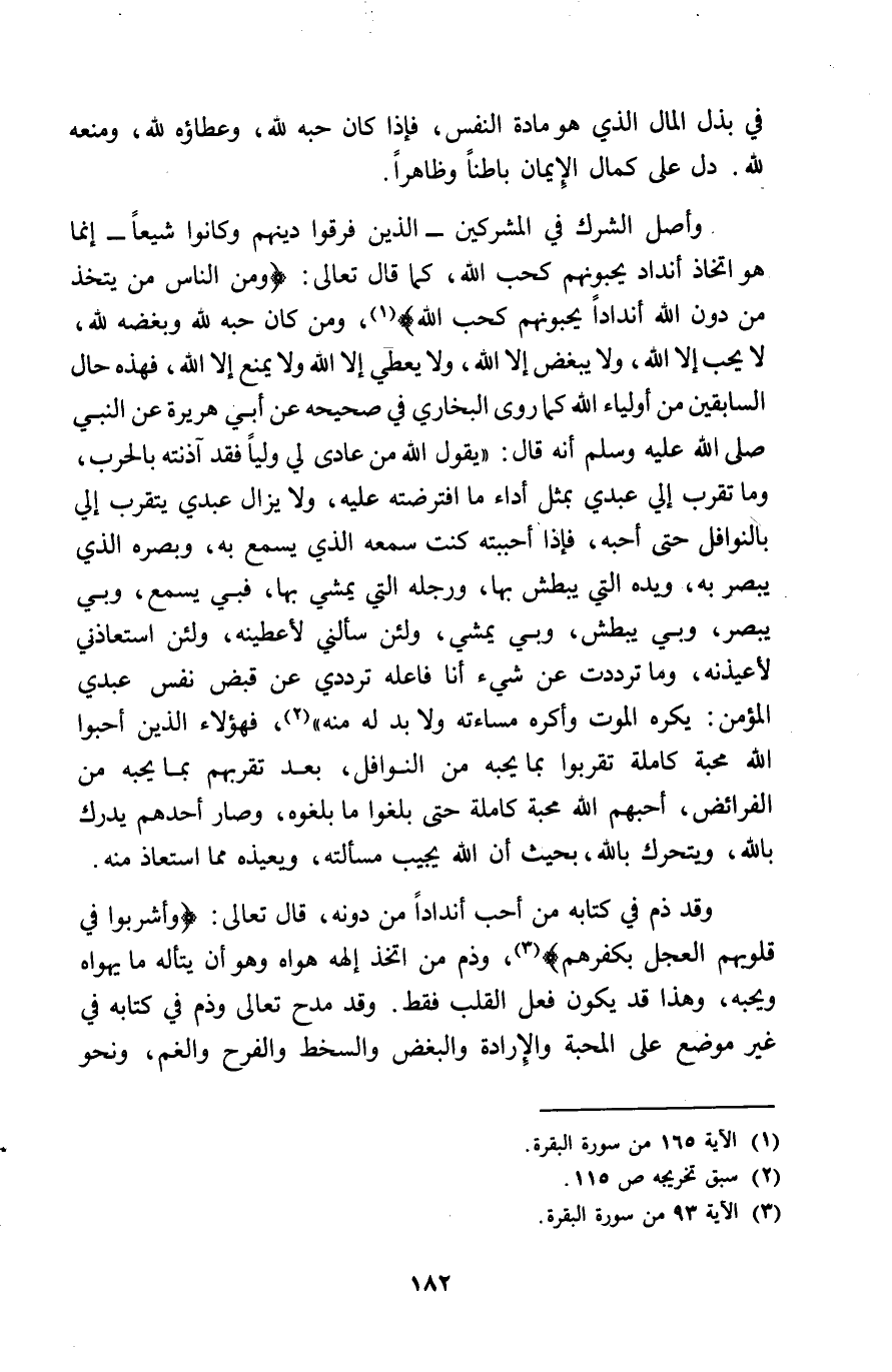 فِي بذل المَال الَّذِي هُوَ مَادَّة النَّفس فاذا كَانَ حبه لله وعطاؤه لله وَمنعه لله دلّ على كَمَال الايمان بَاطِنا وظاهرا وأصل الشّرك فِي الشركين الَّذين فرقوا دينهم وَكَانُوا شيعًا انما هُوَ اتِّخَاذ أنداد يحبونهم كحب الله كَمَا قَالَ تَعَالَى وَمن النَّاس من يتَّخذ من دون الله أندادا يحبونهم كحب الله وَمن كَانَ حبه لله وبغضبه لله لَا يحب الا الله وَلَا يبغض الا الله ولايعطي الا الله وَلَا يمْنَع الا الله فَهَذِهِ حَال السَّابِقين من أَوْلِيَاء الله كَمَا روى البُخَارِيّ فِي صَحِيحه عَن أبي هُرَيْرَة عَن النَّبِي صلى الله عَلَيْهِ وَسلم أَنه قَالَ يَقُول الله من عادى لي وليا فقد آذنته بِالْحَرْبِ وَمَا تقرب الي عَبدِي بِمثل أَدَاء مَا افترضته عَلَيْهِ وَلَا يزَال عَبدِي يتَقرَّب إِلَيّ بالنوافل حَتَّى أحبه فَإِذا أحببته كنت سَمعه الَّذِي يسمع بِهِ وبصره الَّذِي يبصر بِهِ وَيَده الَّتِي يبطش بهَا وَرجله الَّتِي يمشي بهَا فَبِي يسمع وَبِي يبصر وَبِي يبطش وَبِي يمشي وَلَئِن سَأَلَني لأعطينه وَلَئِن استعاذني لأعيذنه وَمَا ترددت عَن شَيْء أَنا فَاعله ترددي عَن قبض نفس عَبدِي الْمُؤمن يكره الْمَوْت وَأَكْثَره مساءته وَلَا بُد لَهُ مِنْهُ فَهَؤُلَاءِ الَّذين أَحبُّوا الله محبَّة كَامِلَة تقربُوا بِمَا يُحِبهُ من النَّوَافِل بعد تقربهم بِمَا يُحِبهُ من الْفَرَائِض أحبهم الله محبَّة كَامِلَة حَتَّى بلغُوا مَا بلغوه وَصَارَ أحدهم يدْرك بِاللَّه ويتحرك بِاللَّه بِحَيْثُ أَن الله يحيب مَسْأَلته ويعذه مِمَّا استعاذ مِنْهُ وَقد ذمّ فِي كِتَابه من أحب أندادا من دونه قَالَ تَعَالَى وأشربوا فِي قُلُوبهم الْعجل بكفرهم وذم من اتخذ الهه هَوَاهُ وَهُوَ أَن يتأله مَا يهواه وَيُحِبهُ وَهَذَا قد يكون فعل الْقلب فَقَط وَقد مدح تَعَالَى وذم فِي كِتَابه فِي غير مَوضِع على الْمحبَّة والارادة والبغض والسخط والفرح وَالْغَم وَنَحْو