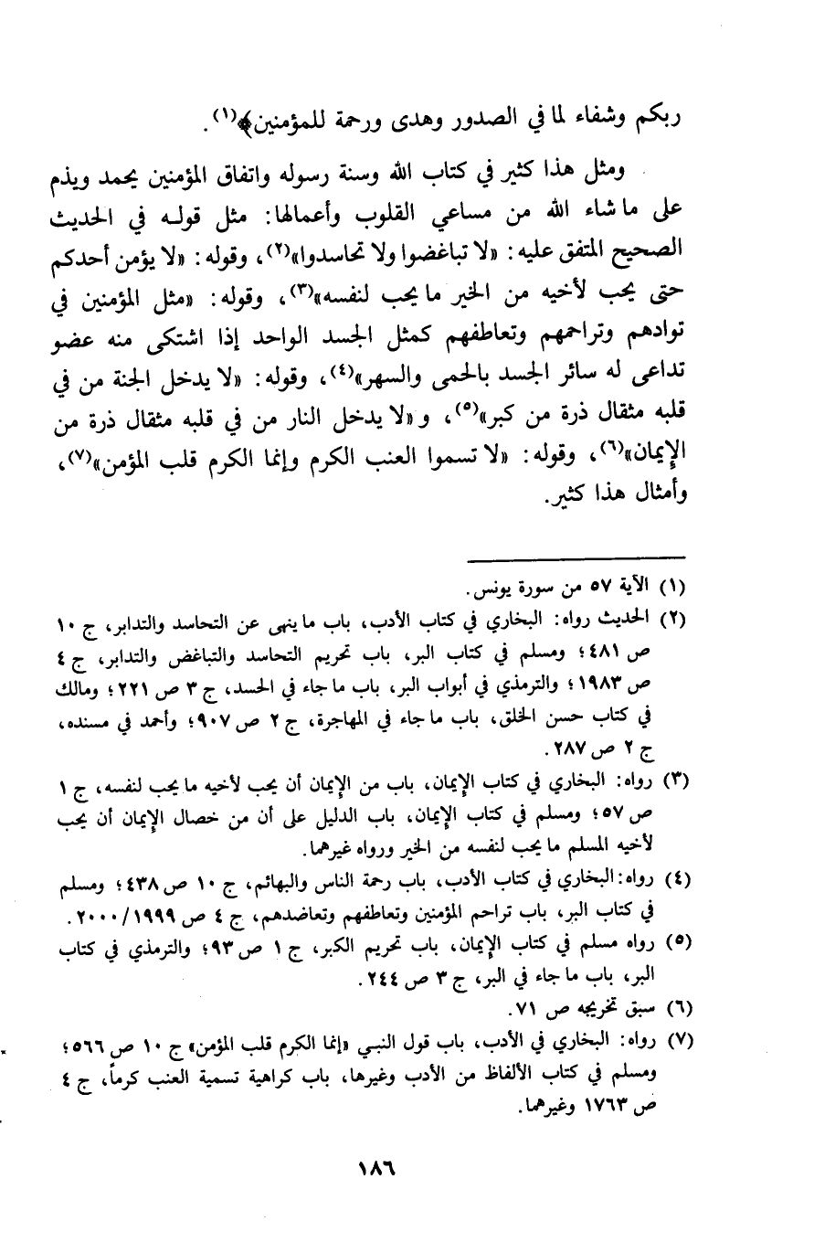 ربكُم وشفاء لما فِي الصُّدُور وَهدى وَرَحْمَة للْمُؤْمِنين وَمثل هَذَا كثير فِي كتاب الله وَسنة رَسُوله واتفاق الْمُؤمنِينَ يحمد ويذم على مَا شَاءَ الله من مساعي الْقُلُوب وأعمالها مثل قَوْله فِي الحَدِيث الصَّحِيح الْمُتَّفق عَلَيْهِ لَا تباغضوا وَلَا تَحَاسَدُوا وَقَوله لَا يُؤمن أحدكُم حَتَّى يحب لِأَخِيهِ من الْخَيْر مَا يحب لنَفسِهِ وَقَوله مثل الْمُؤمنِينَ فِي توادهم وتراحمهم وتعاطفهم كَمثل الْجَسَد الْوَاحِد اذا اشْتَكَى مِنْهُ عُضْو تداعى لَهُ سَائِر الْجَسَد بالحمى والسهر وَقَوله لَا يدْخل الْجنَّة من فِي قلبه مِثْقَال ذرة من كبر وَلَا يدْخل النَّار من فِي قلبه مِثْقَال ذرة من الايمان وَقَوله لَا تسموا الْعِنَب الْكَرم وانما الْكَرم قلب الْمُؤمن وأمثال هَذَا كثير