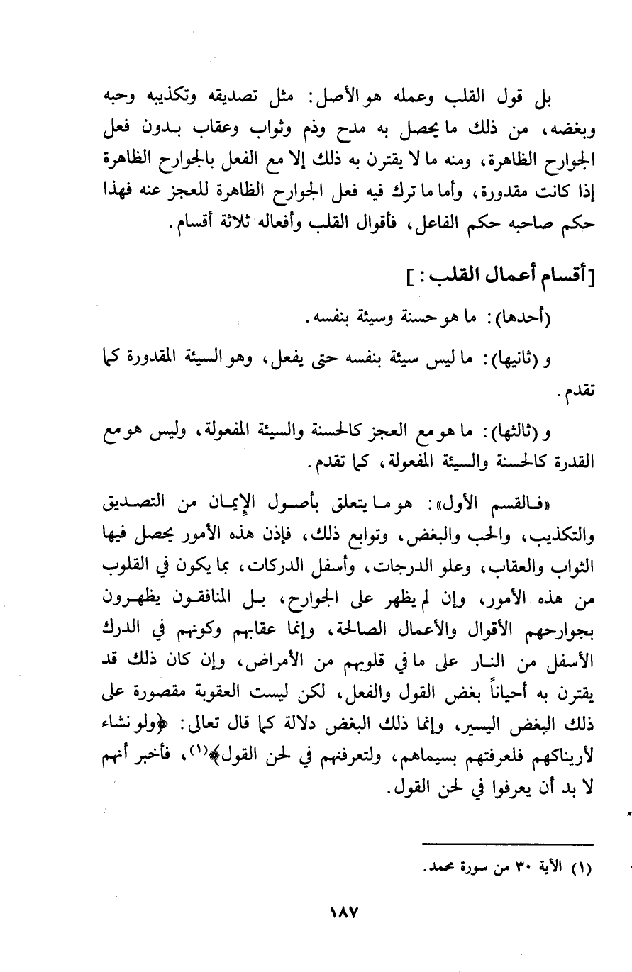 بل قَول الْقلب وَعَمله هُوَ الأَصْل مثل تَصْدِيقه وتكذيبه وحبه وبغضه من ذَلِك مَا يحصل بِهِ مدح وذم وثواب وعقاب بِدُونِ فعل الْجَوَارِح الظَّاهِرَة وَمِنْه مَا لَا يقْتَرن بِهِ ذَلِك الا مَعَ الْفِعْل بالجوارح الظَّاهِرَة اذا كَانَت مقدورة وَأما مَا ترك فِيهِ فعل الْجَوَارِح الظَّاهِرَة للعجز عَنهُ فَهَذَا حكم صَاحبه حكم الْفَاعِل فأقوال الْقلب وأفعاله ثَلَاثَة أَقسَام أَقسَام أَعمال الْقلب أَحدهمَا مَا هُوَ حَسَنَة وسيئة بِنَفسِهِ وَثَانِيها مَا لَيْسَ سَيِّئَة بِنَفسِهِ حَتَّى يفعل وَهُوَ السَّيئَة المقدورة كَمَا تقدم وَثَالِثهَا مَا هُوَ مَعَ الْعَجز كالحسنة والسيئة المفعولة وَلَيْسَ هُوَ مَعَ الْقُدْرَة كالحسنة والسيئة المفعولة كَمَا تقدم فالقسم الأول هُوَ مَا يتَعَلَّق بأصول الايمان من التَّصْدِيق والتكذيب وَالْحب والبغض وتوابع ذَلِك فاذن هَذِه الْأُمُور يحصل فِيهَا الثَّوَاب وَالْعِقَاب وعلو الدَّرَجَات وأسفل الدركات بِمَا يكون فِي الْقُلُوب من هَذِه الْأُمُور وان لم يظْهر على الْجَوَارِح بل المُنَافِقُونَ يظهرون بجوارحهم الْأَقْوَال والأعمال الصَّالِحَة وانما عقابهم وكونهم فِي الدَّرك الْأَسْفَل من النَّار على مَا فِي قُلُوبهم من الْأَمْرَاض وان كَانَ ذَلِك قد يقْتَرن بِهِ أَحْيَانًا بغض القَوْل وَالْفِعْل لَكِن لَيست الْعقُوبَة مَقْصُورَة على ذَلِك البغض الْيَسِير وانما ذَلِك البغض دلَالَة كَمَا قَالَ تَعَالَى وَلَو نشَاء لَأَرَيْنَاكَهُمْ فَلَعَرَفْتهمْ بِسِيمَاهُمْ ولتعرفنهم فِي لحن القَوْل فَأخْبر أَنهم لَا بُد أَن يعرفوا فِي لحن القَوْل