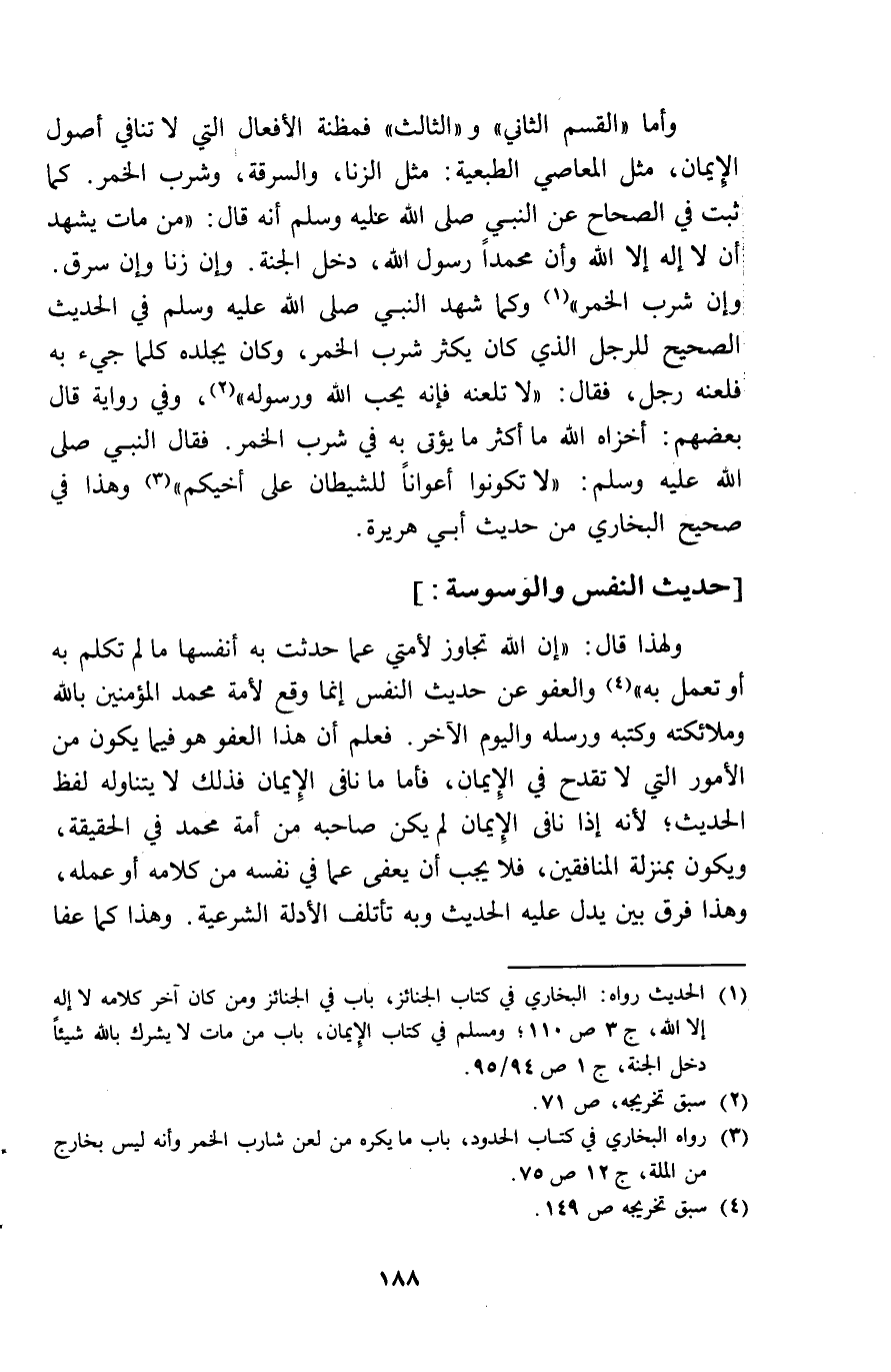 وَأما الْقسم الثَّانِي وَالثَّالِث فمظنة الْأَفْعَال الَّتِي لَا تنَافِي أصُول الايمان مثل الْمعاصِي الطبعية مثل الزِّنَا وَالسَّرِقَة وَشرب الْخمر كَمَا ثَبت فِي الصِّحَاح عَن النَّبِي صلى الله عَلَيْهِ وَسلم أَنه قَالَ من مَاتَ يشْهد أَن لَا اله الا الله وَأَن مُحَمَّدًا رَسُول الله دخل الْجنَّة وان زنا وان سرق وان شرب الْخمر وكما شهد النَّبِي صلى الله عَلَيْهِ وَسلم فِي الحَدِيث الصَّحِيح للرجل الَّذِي كَانَ يكثر شرب الْخمر وَكَانَ يجلده كلما جِيءَ بِهِ فلعنه رجل فَقَالَ لَا تلعنه فانه يحب الله وَرَسُوله وَفِي رِوَايَة قَالَ بَعضهم أَخْزَاهُ الله مَا أَكثر مَا يُؤْتِي بِهِ فِي شرب الْخمر فَقَالَ النَّبِي صلى الله عَلَيْهِ وَسلم لَا تَكُونُوا أعوانا للشَّيْطَان على أخيكم وَهَذَا فِي صَحِيح البُخَارِيّ من حَدِيث أبي هُرَيْرَة حَدِيث النَّفس والوسوسة وَلِهَذَا قَالَ ان الله تجَاوز لأمتي عَمَّا حدثت بِهِ أَنْفسهَا مَا لم تكلم بِهِ أَو تعْمل بِهِ وَالْعَفو عَن حَدِيث النَّفس انما وَقع لأمة مُحَمَّد الْمُؤمنِينَ بِاللَّه وَمَلَائِكَته وَكتبه وَرُسُله وَالْيَوْم الآخر فَعلم أَن هَذَا الْعَفو هُوَ فِيمَا يكون من الْأُمُور الَّتِي لَا تقدح فِي الايمان فَأَما مَا نافى الايمان فَذَلِك لَا يتَنَاوَلهُ لفظ الحَدِيث لِأَنَّهُ اذا نافى الايمان لم يكن صَاحبه من أمة مُحَمَّد فِي الْحَقِيقَة وَيكون بِمَنْزِلَة الْمُنَافِقين فَلَا يجب أَن يُعْفَى عَمَّا فِي نَفسه من كَلَامه أَو عمله وَهَذَا فرق بَين يدل عَلَيْهِ الحَدِيث وَبِه تألفت الْأَدِلَّة الشرعيه وَهَذَا كَمَا عَفا