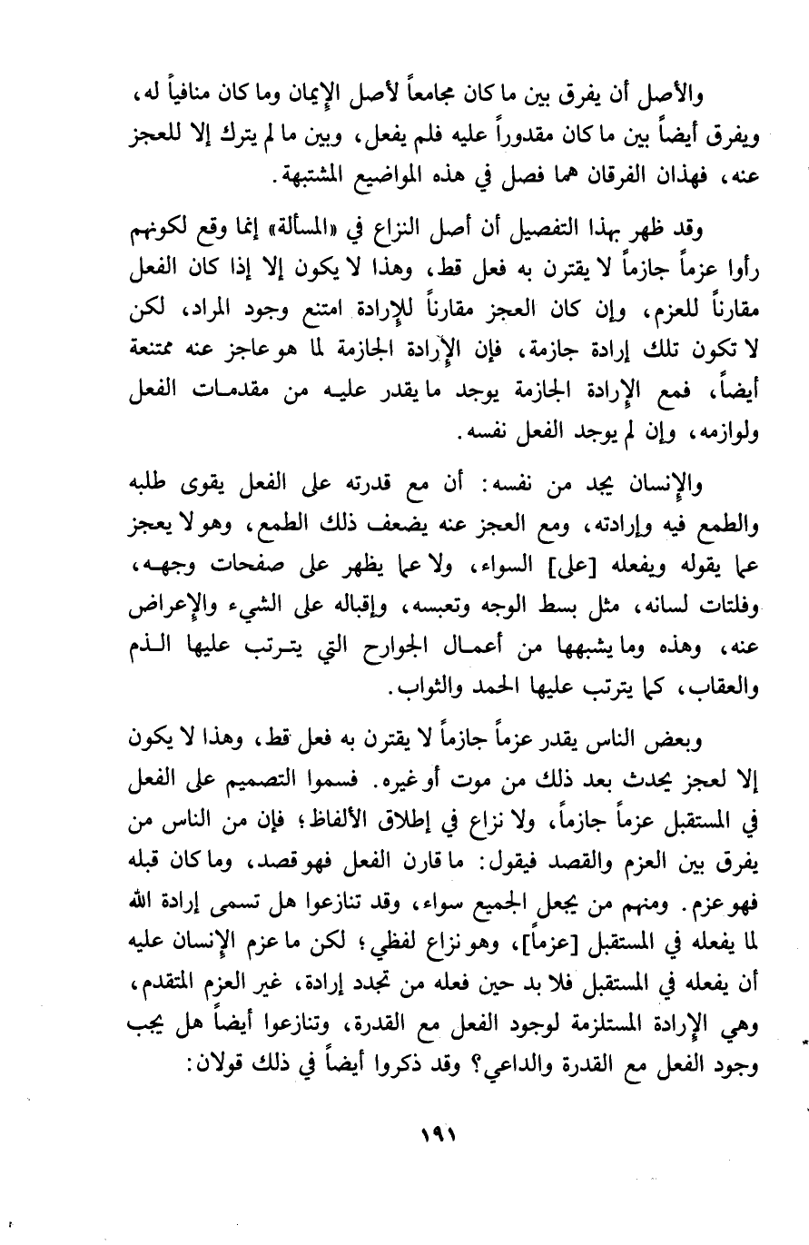 وَالْأَصْل أَن يفرق بَين مَا كَانَ مجامعا لأصل الايمان وَمَا كَانَ منافيا لَهُ وَيفرق أَيْضا بَين مَا كَانَ مَقْدُورًا عَلَيْهِ فَلم يفعل وَبَين مَا لم يتْرك الا للعجز عَنهُ فهذان الْفرْقَان هما فصل فِي هَذِه المواضيع المشتبهة وَقد ظهر بِهَذَا التَّفْصِيل أَن أصل النزاع فِي الْمَسْأَلَة انما وَقع لكَوْنهم رَأَوْا عزما جَازِمًا لَا يقْتَرن بِهِ فعل قطّ وَهَذَا لَا يكون الا اذا كَانَ الْفِعْل مُقَارنًا للعزم وان كَانَ الْعَجز مُقَارنًا للارادة الجازمة لما هُوَ عَاجز عَنهُ ممتنعة أَيْضا فَمَعَ الارادة الجازمة يُوجد مَا يقدر عَلَيْهِ من مُقَدمَات الْفِعْل ولوازمه وان لم يُوجد الْفِعْل نَفسه والانسان يجد من نَفسه أَن مَعَ قدرته على الْفِعْل يقوى طلبه والطمع فِيهِ وارادته وَمَعَ الْعَجز عَنهُ يضعف ذَلِك الطمع وَهُوَ لَا يعجز عَمَّا يَقُوله ويفعله على السوَاء وَلَا عَمَّا يظْهر على صفحات وَجهه وفلتات لِسَانه مثل بسط الْوَجْه وتعبسه واقباله على الشَّيْء والاعراض عَنهُ وَهَذِه وَمَا يشبهها من أَعمال الْجَوَارِح الَّتِي يَتَرَتَّب عَلَيْهَا الذَّم وَالْعِقَاب كَمَا يَتَرَتَّب عَلَيْهَا الْحَمد وَالثَّوَاب وَبَعض النَّاس يقدر عزما جَازِمًا لَا يقْتَرن بِهِ فعل قطّ وَهَذَا لَا يكون الا لعجز يحدث بعد ذَلِك من موت أَو غَيره فسموا التصميم على الْفِعْل فِي الْمُسْتَقْبل عزما جَازِمًا وَلَا نزاع فِي اطلاق الْأَلْفَاظ فان من النَّاس من يفرق بَين الْعَزْم وَالْقَصْد فَيَقُول مَا قَارن الْفِعْل فَهُوَ قصد وَمَا كَانَ قبله فَهُوَ عزم وَمِنْهُم من يَجْعَل الْجَمِيع سَوَاء وَقد تنازعوا هَل تسمى ارادة الله لما يَفْعَله فِي الْمُسْتَقْبل فَلَا بُد حِين فعله من تجدّد ارادة غير الْعَزْم الْمُتَقَدّم وَهِي الارادة المستلزمة لوُجُود الْفِعْل مَعَ الْقُدْرَة وَتَنَازَعُوا أَيْضا هَل يجب وجود الْفِعْل مَعَ الْقُدْرَة والداعي وَقد ذكرُوا أَيْضا فِي ذَلِك قَولَانِ