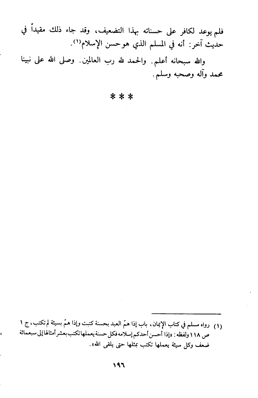 فَلم يوعد لكَافِر على حَسَنَاته بِهَذَا التَّضْعِيف وَقد جَاءَ ذَلِك مُقَيّدا فِي حَدِيث آخر أَنه فِي الْمُسلم الَّذِي هُوَ حسن الاسلام وَالله سُبْحَانَهُ أعلم وَالْحَمْد لله رب الْعَالمين وَصلى الله على نَبينَا مُحَمَّد وَآله وَصَحبه وَسلم
