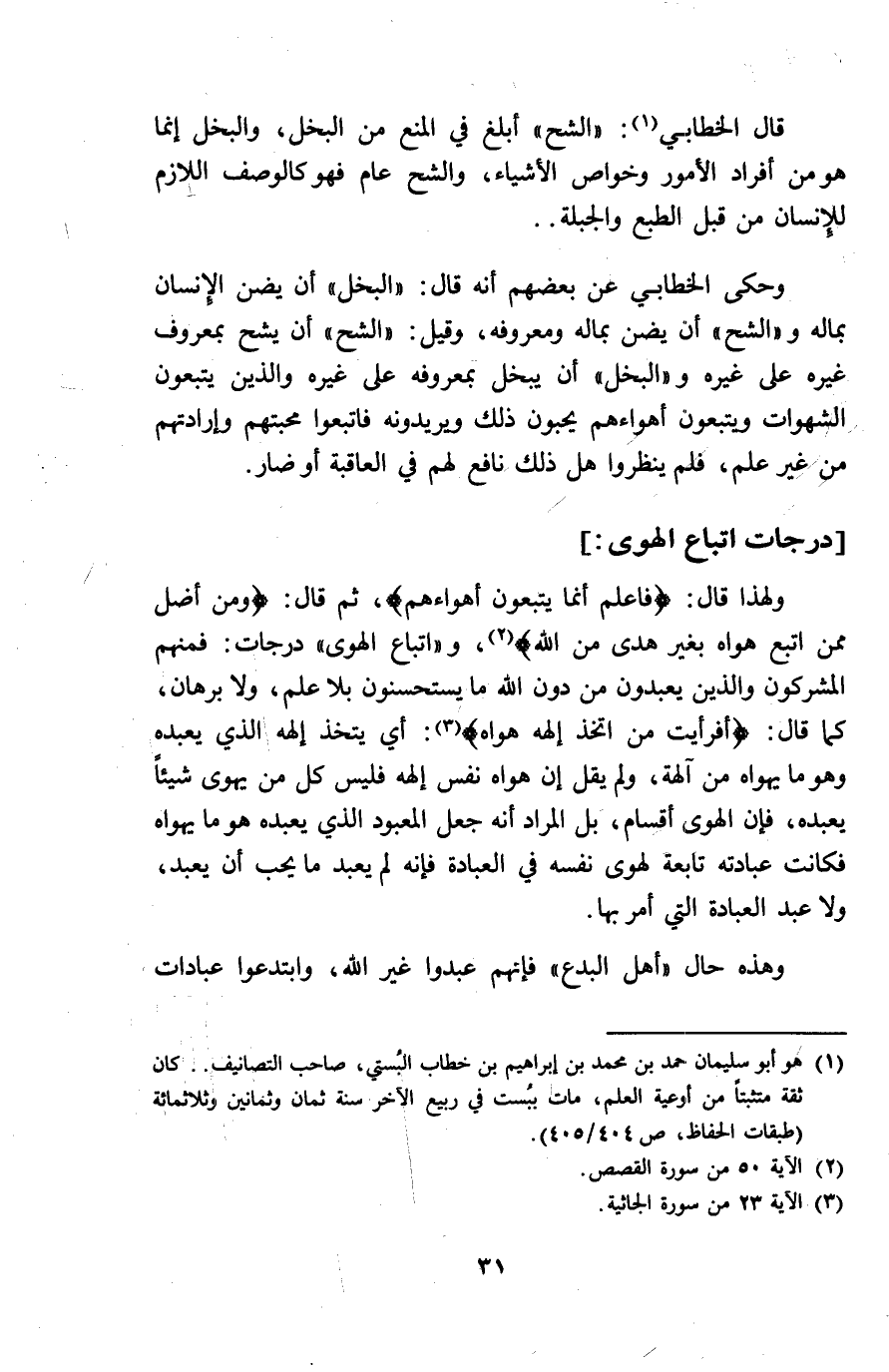 قَالَ الْخطابِيّ الشُّح أبلغ فِي الْمَنْع من الْبُخْل وَالْبخل انما هُوَ من أَفْرَاد الْأُمُور وخواص الْأَشْيَاء وَالشح عَام فَهُوَ كالوصف اللآزم للانسان من قبل الطَّبْع والجبلة وَحكى الْخطابِيّ عَن بعضعهم أَنه قَالَ الْبُخْل أَن يضن الانسان بِمَالِه وَالشح أَن يضن بِمَالِه ومعروفه وَقيل الشُّح أَن يشح بِمَعْرُوف غَيره على غَيره وَالْبخل أَن يبخل بمعروفه على غَيره وَالَّذين يتبعُون الشَّهَوَات ويتبعون أهواءهم يحبونَ ذَلِك ويريدونه فاتبعوا محبتهم وارادتهم من غير علم فَلم ينْظرُوا هَل ذَلِك نَافِع لَهُم فِي الْعَاقِبَة أَو ضار دَرَجَات اتِّبَاع الْهوى وَلِهَذَا قَالَ فَاعْلَم أَنما يتبعُون أهواءهم ثمَّ قَالَ وَمن أضلّ مِمَّن اتبع هَوَاهُ بِغَيْر هدى من الله وَاتِّبَاع الْهوى دَرَجَات فَمنهمْ الْمُشْركُونَ وَالَّذين يعْبدُونَ من دون الله مَا يتسحسنون بِلَا علم وَلَا برهَان كَمَا قَالَ أَفَرَأَيْت من أَتَّخِذ اله هَوَاهُ أَي يتَّخذ الهه الَّذِي يعبده وَهُوَ مَا يهواه من آلِهَة وَلم يقل ان هَوَاهُ نفس الهه فَلَيْسَ كل من يهوى شَيْئا يعبده فَإِن الْهوى أَقسَام بل المُرَاد أَنه جعل المعبود الَّذِي يعبده هُوَ مَا يهواه فَكَانَت عِبَادَته تَابِعَة لهوى نَفسه فِي الْعِبَادَة فَإِنَّهُ لم يعبد مَا يحب أَن يعبد وَلَا عبد الْعِبَادَة الَّتِي أَمر بهَا وَهَذِه حَال أهل الْبدع فَإِنَّهُم عبدُوا غير الله وابتدعوا عبادات