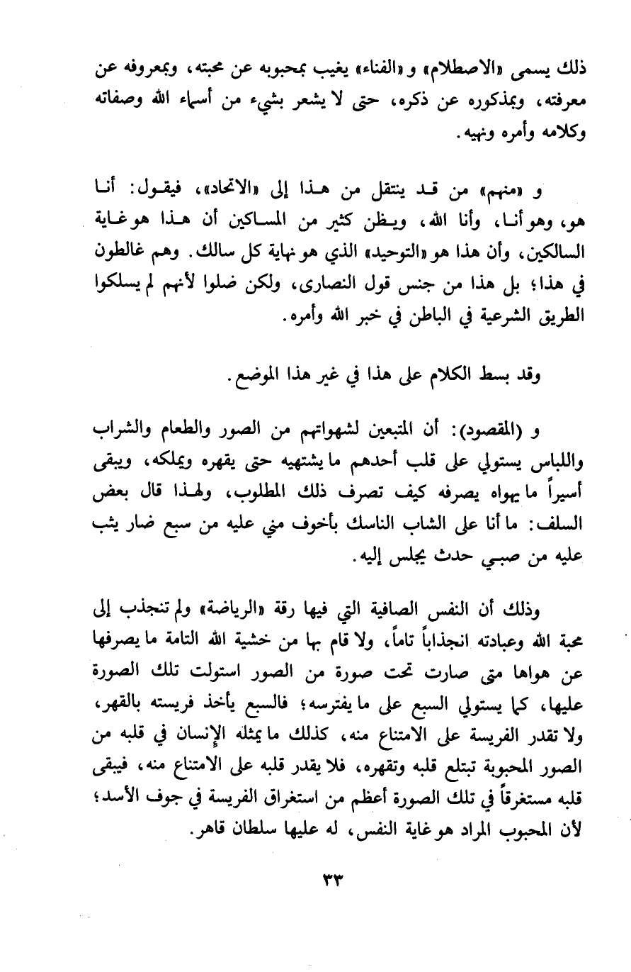 ذَلِك يُسمى الاصطلام والفناء يغيب بمحبوبه عَن محبته وبمعروفه عَن مَعْرفَته وبمذكوره عَن ذكره حَتَّى لَا يشْعر بِشَيْء من أَسمَاء الله وَصِفَاته وَكَلَامه وَأمره وَنَهْيه وَمِنْهُم من قد ينْتَقل من هَذَا الى الِاتِّحَاد فَيَقُول أَنا هُوَ وَهُوَ أَنا وانا الله ويظن كثير من الْمَسَاكِين أَن هَذَا هُوَ غَايَة السالكين وَأَن هَذَا هُوَ التَّوْحِيد الَّذِي هُوَ نِهَايَة كل سالك وهم غالطون فِي هَذَا بل هَذَا من جنس قَول النَّصَارَى وَلَكِن ضلوا لأَنهم لم يسلكوا الطَّرِيق الشرعيه فِي الْبَاطِن فِي خبر الله وَأمره وَقد بسط الْكَلَام على هَذَا فِي غير هَذَا الْموضع وَالْمَقْصُود أَن المتبعين لشهواتهم من الصُّور وَالطَّعَام وَالشرَاب واللباس يستولي على قلب أحدهم مَا يشتهيه حَتَّى يَقْهَرهُ ويملكه وَيبقى أَسِيرًا مَا يهواه يصرفهُ كَيفَ تصرف ذَلِك الْمَطْلُوب وَلِهَذَا قَالَ بعض السّلف مَا أَنا على الشَّاب الناسك بأخوف مني عَلَيْهِ من سبع ضار يثب عَلَيْهِ من صبي حدث يجلس اليه وَذَلِكَ أَن النَّفس الصافية الَّتِي فِيهَا رقة الرياضة وَلم تنجذب الى محبَّة الله وعبادته انجذابا تَاما وَلَا قَامَ بهَا من خشيَة الله التَّامَّة مَا يصرفهَا عَن هَواهَا مَتى صَارَت تَحت صُورَة من الصُّور استولت تِلْكَ الصُّورَة عَلَيْهَا كَمَا يستولي السَّبع على مَا يفترسه فالسبع يَأْخُذ فريسته بالقهر وَلَا تقدر الفريسة على الِامْتِنَاع مِنْهُ كَذَلِك مَا يمثله الانسان فِي قلبه من الصُّور المحبوبة تبتلع قبله وتقهره فَلَا يقدر قلبه على الِامْتِنَاع مِنْهُ فَيبقى قلبه مُسْتَغْرقا فِي تِلْكَ الصُّورَة أعظم من استغراق الفريسة فِي جَوف الْأسد لِأَن المحبوب المُرَاد هُوَ غَايَة النَّفس لَهُ عَلَيْهَا سُلْطَان قاهر