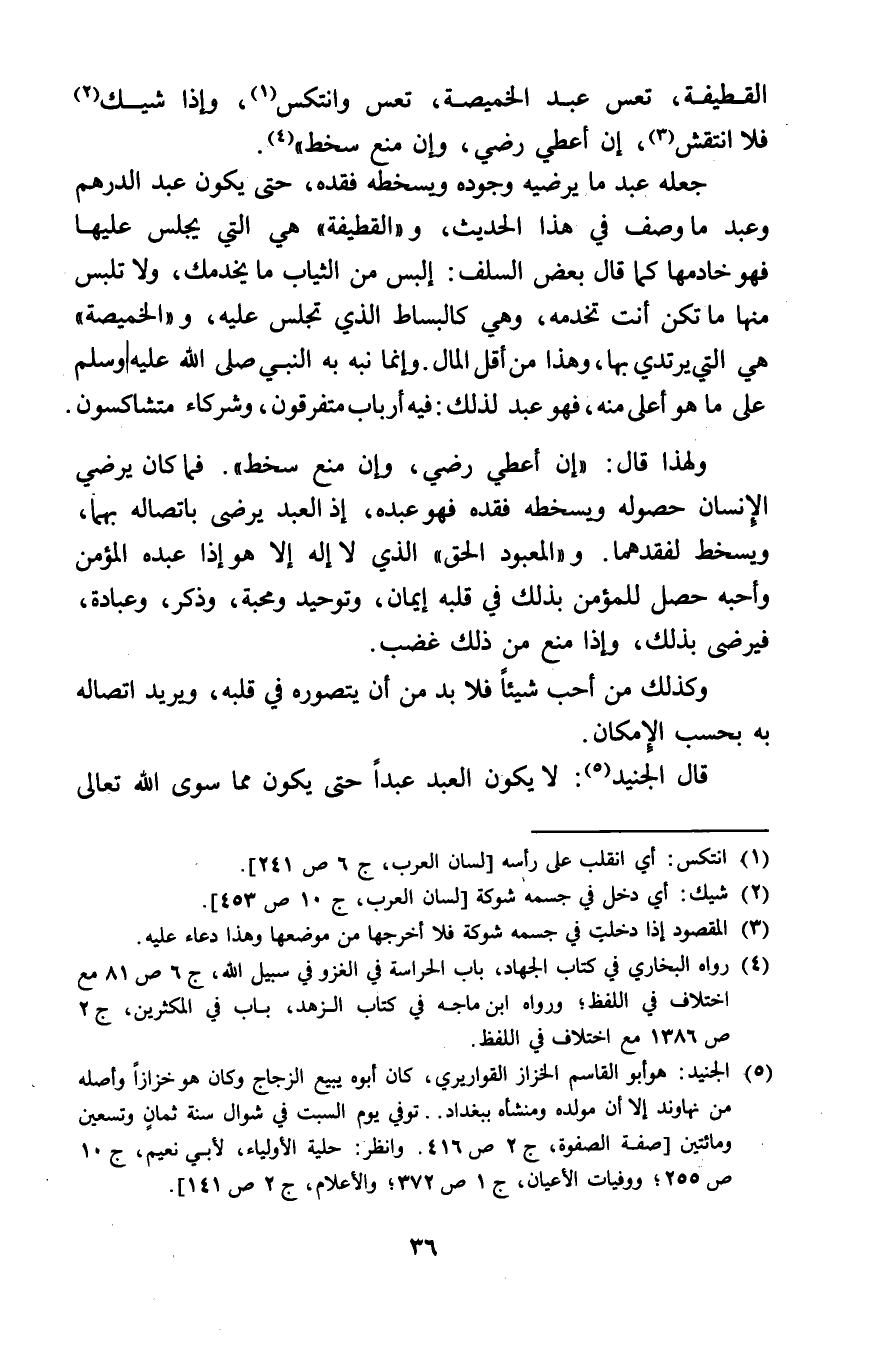 القطيفة تعس عبد الخميصة تعس وانتكس واذا شيك فَلَا انتقش ان أعطي رَضِي وَإِن منع سخط جعله عبد مَا يرضيه وجوده ويسخطه فَقده حَتَّى يكون عبد الدِّرْهَم وَعبد مَا وصف فِي هَذَا الحَدِيث والقطيفة هِيَ الَّتِي يجلس عَلَيْهَا فَهُوَ خَادِمهَا كَمَا قَالَ بعض السّلف البس من الثِّيَاب مَا يخدمك وَلَا تلبس مِنْهَا مَا تكن أَنْت تخدمه وَهِي كالبساط الَّذِي تجْلِس عَلَيْهِ والخميصة هِيَ الَّتِي يرتدي بهَا وَهَذَا من أقل المَال وَإِنَّمَا نبه بِهِ النَّبِي صلى الله عَلَيْهِ وَسلم على مَا هُوَ أَعلَى مِنْهُ فَهُوَ عبد لذَلِك فِيهِ أَرْبَاب متفرقون وشركاء متشاكسون وَلِهَذَا قَالَ ان أعطي رَضِي وَإِن منع سخظ فَمَا كَانَ يُرْضِي الانسان حُصُوله ويسخطه فَقده فَهُوَ عَبده اذ العَبْد يرضى باتصاله بهما ويسخط لفقدهما والمعبود الْحق الَّذِي لَا اله الا هُوَ اذا عَبده الْمُؤمن وأخيه حصل لِلْمُؤمنِ بذلك فِي قلبه ايمان وتوحيد ومحبة وَذكر وَعبادَة فيرضى بذلك واذا منع من ذَلِك غضب وَكَذَلِكَ من أحب شَيْئا فَلَا بُد من أَن يتصوره فِي قلبه وَيُرِيد اتِّصَاله بِهِ بِحَسب الامكان قَالَ الْجُنَيْد لَا يكون العَبْد عبدا حَتَّى يكون مِمَّا سوى الله تَعَالَى