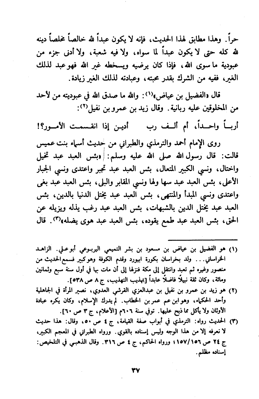 حرا وَهَذَا مُطَابق لهَذَا الحَدِيث فَإِنَّهُ لَا يكون عبدا لله خَالِصا مخلصا دينه لله كُله حَتَّى لَا يكون عبدا لما سواهُ وَلَا فِيهِ شُعْبَة وَلَا أدنى جُزْء من عبودية مَا سوى الله فَإِذا كَانَ يرضيه ويسخطه غير الله فَهُوَ عبد لذَلِك الْغَيْر فَفِيهِ من الشّرك بِقدر محبته وعبادته لذَلِك الْغَيْر زِيَادَة قَالَ الفضيل بن عِيَاض وَالله مَا صدق الله فِي عبوديته من لأحد من المخلوقين عَلَيْهِ ربانية وَقَالَ زيد بن عَمْرو بن نفَيْل أربا وَاحِدًا أم ألف ربأدين اذا انقسمت الْأُمُور روى الامام أَحْمد وَالتِّرْمِذِيّ وَالطَّبَرَانِيّ من حَدِيث أَسمَاء بنت عُمَيْس قَالَت قَالَ رَسُول الله صلى الله عَلَيْهِ بئس العَبْد عبد تخيل واختال وَنسي الْكَبِير المتعال بئس العَبْد عبد تجبر واعتدى وَنسي الْجَبَّار الْأَعْلَى بئس العَبْد عبد سَهَا وَلها وَنسي الْمَقَابِر والبلى بئس العَبْد عبد بغى واعتدى وَنسي المبدأ والمنتهى بئس العَبْد عبد ال دنيا بِالدّينِ بئس العَبْد عبد يخْتل الدّين بِالشُّبُهَاتِ بئس العَبْد عبد رغب يذله ويزيله عَن الْحق بئس العَبْد عبد طمع يَقُودهُ بئس العَبْد عبد هوى يضله قَالَ