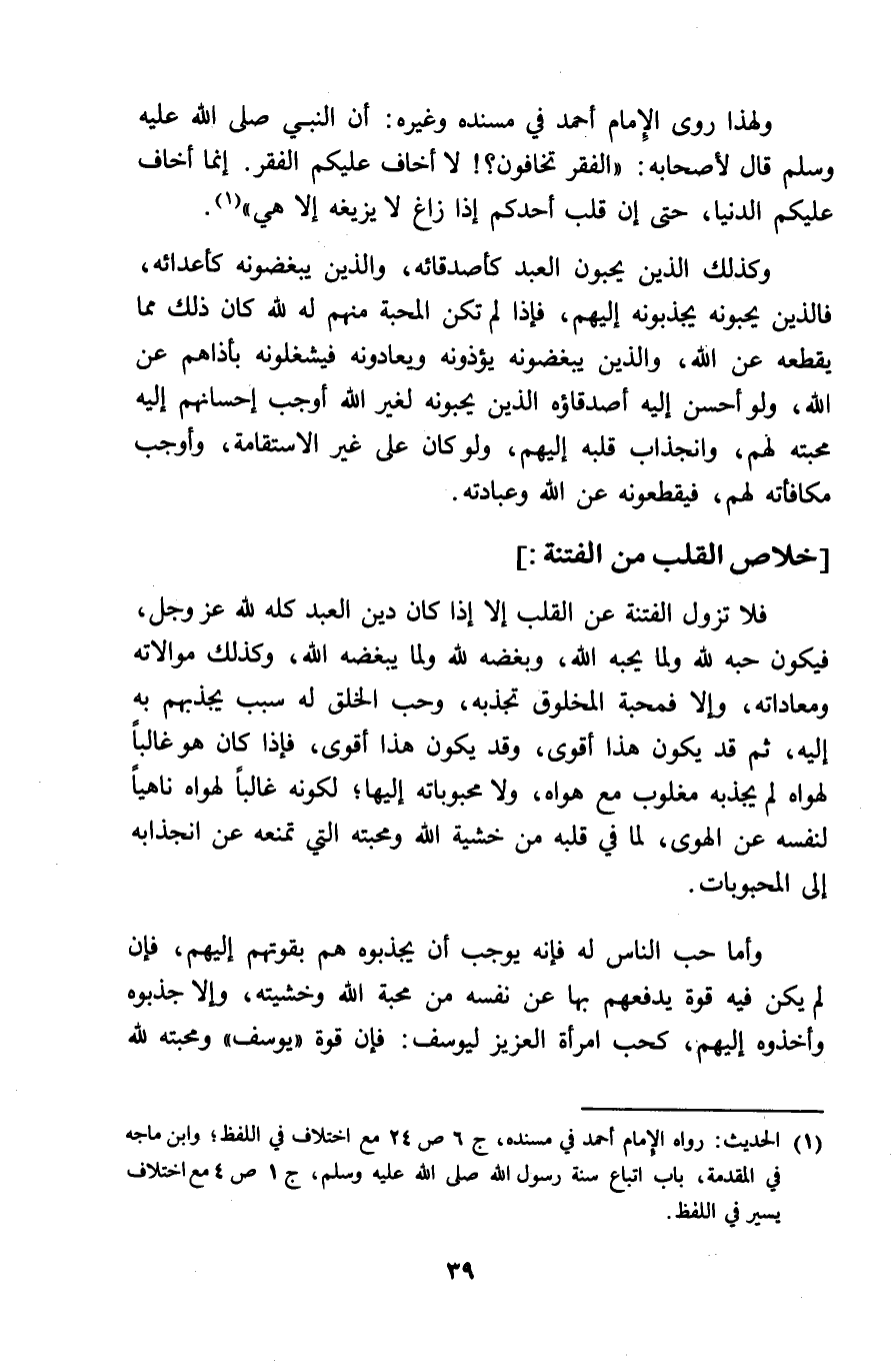 وَلِهَذَا روى الامام أَحْمد فِي مُسْنده وَغَيره أَن النَّبِي صلى الله عَلَيْهِ وَسلم قَالَ لأَصْحَابه الْفقر تخافون لَا أَخَاف عَلَيْكُم الْفقر انما أَخَاف عَلَيْكُم الدُّنْيَا حَتَّى ان قلب أحدكُم اذا زاغ لَا يزيغه الا هِيَ وَكَذَلِكَ الَّذين يحبونَ العَبْد كأصدقائه وَالَّذين يبغضونه كأعدائه فَالَّذِينَ يحبونه يجذبونه اليهم فاذا لم تكن الْمحبَّة مِنْهُم لَهُ لله كَانَ ذَلِك مِمَّا يقعطه عَن الله وَالَّذين يبغضونه يؤذونه ويعادونه فيشغلونه بأذاهم عَن الله وَلَو أحسن اليه أصدقاؤه الَّذين يحبونه لغير الله أوجب احسانهم اليه محبته لَهُم وانجذاب قلبه اليهم وَلَو كَانَ على غير الاسْتقَامَة وَأوجب مكافأته لَهُم فيقطعونه عَن الله وعبادته خلاص الْقلب من الْفِتْنَة فَلَا تَزُول الْفِتْنَة عَن الْقلب الا اذا كَانَ دين العَبْد كُله لله عز وَجل فَيكون حبه لله وَلما يُحِبهُ الله وبغضبه لله وَلما يبغضه الله وَكَذَلِكَ موالاته ومعاداته والا فمحبة الْمَخْلُوق تجذبه وَحب الْخلق لَهُ سَبَب يجذبهم بِهِ اليه ثمَّ قد يكون هَذَا أقوى وَقد يكون هَذَا أقوى فَإِذا كَانَ هُوَ غَالِبا لهواه لم يجذبه مغلوب مَعَ هَوَاهُ وَلَا محبوباته اليها لكَونه غَالِبا لهواه ناهيا لنَفسِهِ عَن الْهوى لما فِي قلبه من خشيَة الله ومحبته الَّتِي تَمنعهُ عَن انجذابه الى المحبوبات وَأما حب النَّاس لَهُ فَإِنَّهُ يُوجب أَن يجذبوه هم بقوتهم اليهم فَإِن لم يكن فِيهِ قُوَّة يدفعهم بهَا عَن نَفسه من محبَّة الله وخشيته وَإِلَّا جذبوه وأخذوه اليهم كحب امْرَأَة الْعَزِيز ليوسف فَإِن قُوَّة يُوسُف ومحبته لله