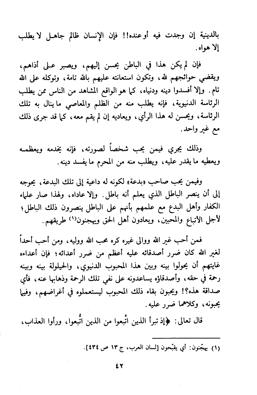 بالدينية ان وجدت فِيهِ أَو عِنْده فَإِن الانسان ظَالِم جَاهِل لَا يطْلب الا هَوَاهُ فَإِن لم يكن هَذَا فِي الْبَاطِن يحسن اليهم ويصبر على أذاهم وَيَقْضِي حوائجهم لله وَتَكون استعانته عَلَيْهِم بِاللَّه تَامَّة وتوكله على الله تَامّ وَإِلَّا أفسدوا دينه ودنياه كَمَا هُوَ الْوَاقِع الْمشَاهد من النَّاس مِمَّن يطْلب الرِّئَاسَة الدُّنْيَوِيَّة فَإِنَّهُ يطْلب مِنْهُ من الظُّلم والمعاصي مَا ينَال بِهِ تِلْكَ الرِّئَاسَة وَيحسن لَهُ هَذَا الرَّأْي ويعاديه ان لم يقم مَعَه كَمَا قد جرى ذَلِك مَعَ غير وَاحِد وَذَلِكَ يجْرِي فِيمَن يحب شخصا لصورته فَإِنَّهُ يَخْدمه ويعظمه وَيُعْطِيه مَا يقدر عَلَيْهِ وَيطْلب مِنْهُ من الْمحرم مَا يفْسد دينه وفيمن يحب صَاحب بِدعَة لكَونه لَهُ دَاعِيَة الى تِلْكَ الْبِدْعَة يحوجه الى أَن ينصر الْبَاطِل الَّذِي يعلم أَنه بَاطِل والا عَادَاهُ وَلِهَذَا صَار عُلَمَاء الْكفَّار وَأهل الْبدع مَعَ علمهمْ بِأَنَّهُم على الْبَاطِل ينْصرُونَ ذَلِك الْبَاطِل لأجل الأتباع والمحبين ويعادون أهل الْحق ويهجنون طريقهم فَمن أحب غير الله ووالى غَيره كره محب الله ووليه وَمن أحب أحدا لغير الله كَانَ ضَرَر أصدقائه عَلَيْهِ أعظم من ضَرَر أعدائه فَإِن أعداءه غايتهم أَن يحولوا بَينه وَبَين هَذَا المحبوب الدنيوي والحيلوله بَينه وَبَينه رَحْمَة فِي حَقه وأصدقاؤه يساعدونه على نفي تِلْكَ الرَّحْمَة وذهابها عَنهُ فَأَي صداقة هَذِه وَيُحِبُّونَ بَقَاء ذَلِك المحبوب ليستعملوه فِي أغراضهم وَفِيمَا يحبونه وَكِلَاهُمَا ضَرَر عَلَيْهِ قَالَ تَعَالَى اذ تَبرأ الَّذين اتبعُوا من الَّذين اتبعُوا وَرَأَوا الغذاب