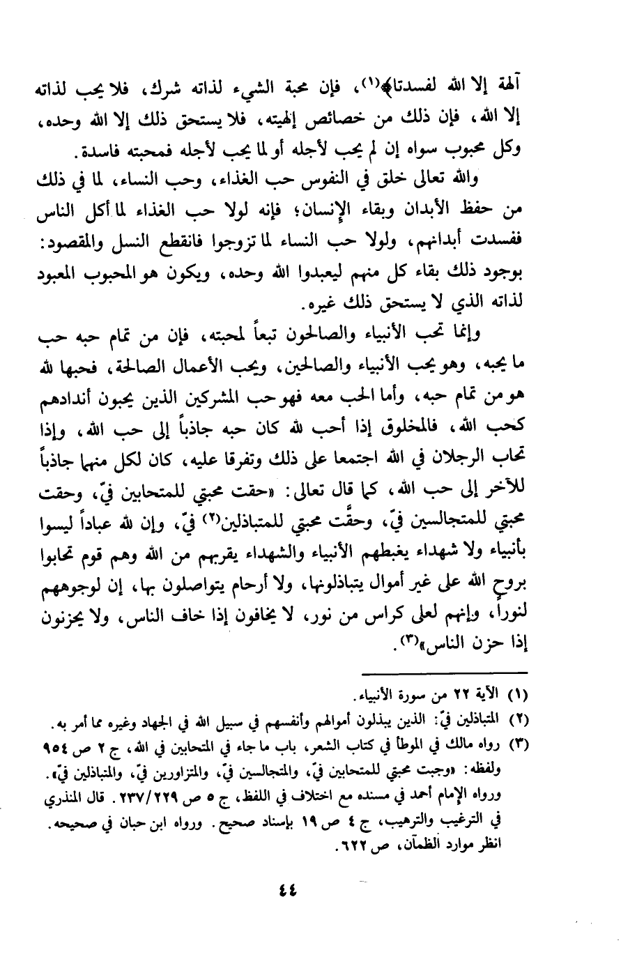 آلِهَة الا الله لفسدتا ف الله فغن ذَلِك من خَصَائِص اليهيته فَلَا يسْتَحق ذَلِك الا الله وَحده وكل مَحْبُوب سواهُ ان لم يحب لأَجله أَو لما يحب لأَجله فمحبته فَاسِدَة وَالله تَعَالَى خلف فِي النُّفُوس حب الْغذَاء وَحب النِّسَاء لما فِي ذَلِك من حفظ الْأَبدَان وَبَقَاء الانسان ف وَلَوْلَا حب النِّسَاء لما تزوجوا فَانْقَطع النَّسْل وَالْمَقْصُود بِوُجُود ذَلِك بَقَاء كل مِنْهُم ليعبدوا الله وَحده وَيكون هُوَ المحبوب المعبود لذاته الَّذِي لَا يسْتَحق ذَلِك غَيره وانما تحب الْأَنْبِيَاء والصالحوب تبعا لمحبته فَإِن من تَمام حبه حب مَا يُحِبهُ وَهُوَ يحب الْأَنْبِيَاء وَالصَّالِحِينَ وَيُحب الْأَعْمَال الصَّالِحَة فحبها لله هُوَ من تَمام حبه وَأما الْحبّ مَعَه فَهُوَ حب الْمُشْركين الَّذين يحبونَ أنندادهم كحب الله فالمخلوق اذا أحب لله كَانَ حبه جاذبا الى حب الله واذا تحاب الرّجلَانِ فِي الله اجْتمعَا على ذَلِك وتفرقا عَلَيْهِ كَانَ لكل مِنْهُمَا جاذبا للْآخر الى حب الله كَمَا قَالَ تَعَالَى حقت محبتي للمتحابين فِي وحقت محبتي للمتجالسين فِي وحقت محبتي للمتباذلين فِي وَإِن لله عبادا لَيْسُوا بِأَنْبِيَاء وَلَا شُهَدَاء يَغْبِطهُمْ الْأَنْبِيَاء وَالشُّهَدَاء يقربهُمْ من الله وهم قوم تحَابوا بِروح الله على غير أَمْوَال يتباذلونها وَلَا أَرْحَام يتواصلون بهَا ان لوجوههم لنورا وَإِنَّهُم لعلى كراس من نور لَا يخَافُونَ اذا خَافَ النَّاس وَلَا يَحْزَنُونَ اذا حزن النَّاس