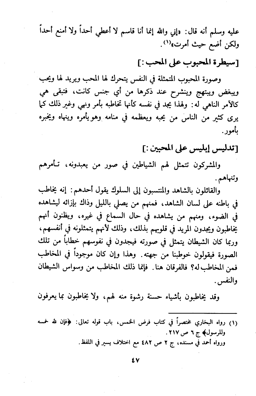 عَلَيْهِ وَسلم أَنه قَالَ اني وَالله انما أَنا قَاسم لَا أعطي أحدا وَلَا أمنع أحدا وَلَكِن أَضَع حَيْثُ أمرت سيطرة المحبوب على الْمُحب وَصُورَة المحبوب المتمثلة فِي النَّفس يَتَحَرَّك لَهَا الْمُحب وَيُرِيد لَهَا وَيُحب وَيبغض ويبتهج وينشرح عِنْد ذكرهَا من أَي جنس كَانَت فَتبقى هِيَ كالآمر الناهي لَهُ وَلِهَذَا يجد فِي نَفسه كَأَنَّهَا تخاطبه بِأَمْر وَنهي وَغير ذَلِك كَمَا يرى كثير من النَّاس من يُحِبهُ ويعظمه فِي مَنَامه وَهُوَ يَأْمُرهُ وينهاه ويخبره بِأُمُور تَدْلِيس ابليس على المحبين وَالْمُشْرِكُونَ تتمثل لَهُم الشَّيَاطِين فِي صور من يعبدونه تَأْمُرهُمْ وتنهاهم والقائلون بِالشَّاهِدِ والمنتسبون الى السلوك يَقُول أحدهم انه يُخَاطب فِي بَاطِنه على لِسَان الشَّاهِد فَمنهمْ من يُصَلِّي بِاللَّيْلِ وَذَلِكَ بازائه ليشاهده فِي الضَّوْء وَمِنْهُم من يُشَاهِدهُ فِي حَال السماع فِي غَيره ويظنون أَنهم يخاطبون ويجدون المريد فِي قُلُوبهم بذلك وَذَلِكَ لأَنهم يتمثلونه فِي أنفسهم وَرُبمَا كَانَ الشَّيْطَان يتَمَثَّل فِي صورته فيجدون فِي نُفُوسهم خطابا من تِلْكَ الصُّورَة فَيَقُولُونَ خوطبنا من جِهَته وَهَذَا وَإِن كَانَ مَوْجُودا فِي الْمُخَاطب فَمن الْمُخَاطب لَهُ فالفرقان هُنَا فَأَما ذَلِك الْمُخَاطب من وسواس الشَّيْطَان وَالنَّفس وَقد يخاطبون بأَشْيَاء حَسَنَة رشوة مِنْهُ لَهُم وَلَا يخاطبون بِمَا يعْرفُونَ