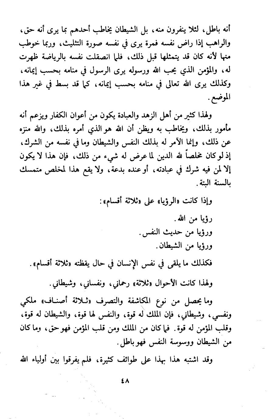 أَنه بَاطِل لِئَلَّا ينفرون مِنْهُ بل الشَّيْطَان يُخَاطب أحدهم بِمَا يرى أَنه حق والراهب اذا رَاض نَفسه فَمرَّة يرى فِي نَفسه صُورَة التَّثْلِيث وَرُبمَا خُوطِبَ مِنْهَا لِأَنَّهُ كَانَ قد يتمثلها قبل ذَلِك فَلَمَّا انصقلت نَفسه بالرياضة ظَهرت لَهُ وَالْمُؤمن الَّذِي يحب الله وَرَسُوله يرى الرَّسُول فِي مَنَامه بِحَسب ايمانه وَكَذَلِكَ يرى الله تَعَالَى فِي مَنَامه بِحَسب ايمانه كَمَا قد بسط فِي غير هَذَا الْمَوْضُوع وَلِهَذَا كثير من أهل الزّهْد وَالْعِبَادَة يكون من أعوان الْكفَّار وَيَزْعُم أَنه مَأْمُور بذلك ويخاطب بِهِ ويظن أَن الله هُوَ الَّذِي أمره بذلك وَالله منزه عَن ذَلِك وَإِنَّمَا الْآمِر لَهُ بذلك النَّفس والشيطان وَمَا فِي نَفسه من الشّرك اذ لَو كَانَ مخلصا لله الدّين لما عرض لَهُ شَيْء من ذَلِك فَإِن هَذَا لَا يكون الا لمن فِيهِ شرك فِي عِبَادَته أَو عِنْده بِدعَة وَلَا يَقع هَذَا لمخلص متمسك بِالسنةِ الْبَتَّةَ واذا كَانَت الرُّؤْيَا على ثَلَاثَة أَقسَام رُؤْيا من الله ورؤيا من حَدِيث النَّفس ورؤيا من الشَّيْطَان فَكَذَلِك مَا يلقى فِي نفس الانسان فِي حَال يقظته ثَلَاثَة أَقسَام وَلِهَذَا كَانَت الْأَحْوَال ثَلَاثَة رحماني ونفساني وشيطاني وَمَا يحصل من نوع المكاشفة وَالتَّصَرُّف ثَلَاثَة أَصْنَاف ملكي وَنَفْسِي وشيطاني فَإِن الْملك لَهُ قُوَّة وَالنَّفس لَهَا قُوَّة والشيطان لَهُ قُوَّة وقلب الْمُؤمن لَهُ قُوَّة فَمَا كَانَ من الْملك وَمن قلب الْمُؤمن فَهُوَ حق وَمَا كَانَ من الشَّيْطَان ووسوسة النَّفس فَهُوَ بَاطِل وَقد اشْتبهَ هَذَا بِهَذَا على طوائف كَثِيرَة فَلم يفرقُوا بَين أَوْلِيَاء الله