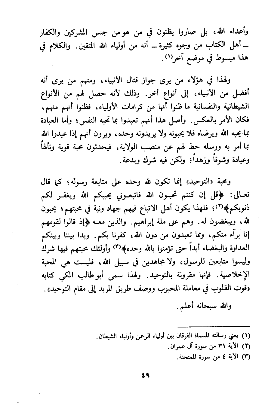 وأعداء الله بل صَارُوا يظنون فِي من هُوَ من جنس الْمُشْركين وَالْكفَّار أهل الْكتاب من وُجُوه كَثِيرَة أَنه من أَوْلِيَاء الله الْمُتَّقِينَ وَالْكَلَام فِي هَذَا مَبْسُوط فِي مَوضِع آخر وَلِهَذَا فِي هَؤُلَاءِ من يرى جَوَاز قتال الْأَنْبِيَاء وَمِنْهُم من يرى أَنه أفضل من الْأَنْبِيَاء الى أَنْوَاع آخر وَذَلِكَ لِأَنَّهُ حصل لَهُم من الْأَنْوَاع الشيطانية والنفسانية مَا ظنُّوا أَنَّهَا من كرامات الْأَوْلِيَاء فظنوا أَنهم مِنْهُم فَكَانَ الْأَمر بِالْعَكْسِ وأصل هَذَا أَنهم تعبدوا بِمَا تحبه النَّفس وَأما الْعِبَادَة بِمَا يُحِبهُ الله ويرضاه فَلَا يحبونه وَلَا يريدونه وَحده ويرون أَنهم اذا عبدُوا الله بِمَا أَمر بِهِ وَرُسُله حط لَهُم عَن منصب الْولَايَة فيحدثون محبَّة قَوِيَّة وتألها وَعبادَة وشوقا وزهدا وَلَكِن فِيهِ شرك وبدعة ومحبة التَّوْحِيد انما تكون لله وَحده على مُتَابعَة رَسُوله كَمَا قَالَ تَعَالَى قل ان كُنْتُم تحبون الله فَاتبعُوني يحببكم الله وَيغْفر لكم ذنوبكم فَلهَذَا يكون أهل الِاتِّبَاع فيهم جِهَاد وَنِيَّة فِي محبتهم يحبونَ لله ويبغضون لَهُ وهم على مِلَّة ابراهيم وَالَّذين مَعَه اذ قَالُوا لقومهم انا بُرَآء مِنْكُم وَمِمَّا تَعْبدُونَ من دون الله كفرنا بكم وبدا بَيْننَا وَبَيْنكُم الْعَدَاوَة والبغضاء أبدا حَتَّى تؤمنوا بِاللَّه وَحده وَأُولَئِكَ محبتهم فِيهَا شرك وَلَيْسوا متابعين للرسول وَلَا مجاهدين فِي سَبِيل الله فَلَيْسَتْ هِيَ المحبه الاخلاصية فَإِنَّهَا مقرونة بِالتَّوْحِيدِ وَلِهَذَا سمى أَبُو طَالب الْمَكِّيّ كِتَابه قوت الْقُلُوب فِي مُعَاملَة المحبوب وَوصف طَرِيق المريد الى مقَام التَّوْحِيد وَالله سُبْحَانَهُ أعلم