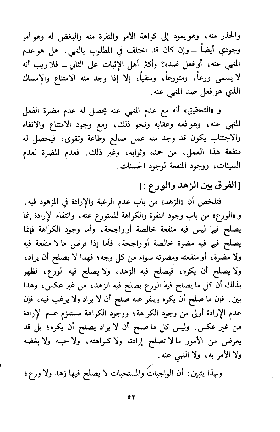 والحذر مِنْهُ وَهُوَ يعود الى كَرَاهَة الْأَمر والنفرة مِنْهُ والبغض لَهُ وَهُوَ أَمر وجودي أَيْضا وَإِن كَانَ قد اخْتلف فِي الْمَطْلُوب بِالنَّهْي هَل هُوَ عدم الْمنْهِي عَنهُ أَو فعل ضِدّه وَأكْثر أهل الاثبات على الثَّانِي فَلَا ريب أَنه لَا يُسمى ورعا ومتورعا ومتقيا الا اذا وجد مِنْهُ الِامْتِنَاع والامساك الَّذِي هُوَ فعل ضد الْمنْهِي عَنهُ وَالتَّحْقِيق أَنه مَعَ عدم الْمنْهِي عَنهُ يحصل لَهُ عدم مضرَّة الْفِعْل الْمنْهِي عَنهُ وَهُوَ ذمَّة وعقابه وَنَحْو ذَلِك وَمَعَ وجود الِامْتِنَاع والاتفاء والاجتناب يكون قد وجد مِنْهُ عمل صَالح وَطَاعَة وتقوى فَيحصل لَهُ مَنْفَعَة هَذَا الْعَمَل من حَمده وثوابه وَغير ذَلِك فَعدم الْمضرَّة لعدم السَّيِّئَات وَوُجُود الْمَنْفَعَة لوُجُود الْحَسَنَات الْفرق بَين الزّهْد والورع فتلخص أَن الزّهْد من بَاب عدم الرَّغْبَة والارادة فِي المزهود فِيهِ والورع من بَاب وجود النفرة وَالْكَرَاهَة للمتورع عَنهُ وَانْتِفَاء الارادة انما يصلح فيهمَا لَيْسَ فِيهِ مَنْفَعَة خَالِصَة أَو راجحة وَأما وجود الْكَرَاهِيَة فانما يصلح فيهمَا فِيهِ مضرَّة خَالِصَة أَو راجحة وَأما وجود الْكَرَاهَة فانما يصلح فِيمَا فِيهِ مضرَّة خَالِصَة أَو راجحة فَأَما اذا فرض مَا لَا مَنْفَعَة فِيهِ وَلَا مضرَّة أَو منفعَته ومضرته سَوَاء من كل وَجه فَهَذَا لَا يصلح أَن يُرَاد وَلَا يصلح أَن يكره فيصلح فِيهِ الزّهْد وَلَا يصلح فِيهِ الْوَرع فَظهر بذلك أَن كل مَا يصلح فِيهِ الْوَرع يصلح فِيهِ الزّهْد من غير عكس وَهَذَا بَين فَإِن مَا صلح أَن يكره وينفر عَنهُ صلح أَن لَا يُرَاد وَلَا يرغب فِيهِ فَإِن عدم الارادة أولى من وجود الْكَرَاهَة وَوُجُود الْكَرَاهَة مُسْتَلْزم عدم الارادة من غير عكس وَلَيْسَ كل مَا صلح أَن لَا يُرَاد يصلح أَن يكره بل قد يعرض من الْأُمُور مَا لَا تصلح ارادته وَلَا كَرَاهَته ونلا حبه وَلَا بغضه وَلَا الْأَمر بِهِ وَلَا النَّهْي عَنهُ وَبِهَذَا يتَبَيَّن أَن الْوَاجِبَات والمستحبات لَا يصلح فِيهَا زهد وَلَا ورع