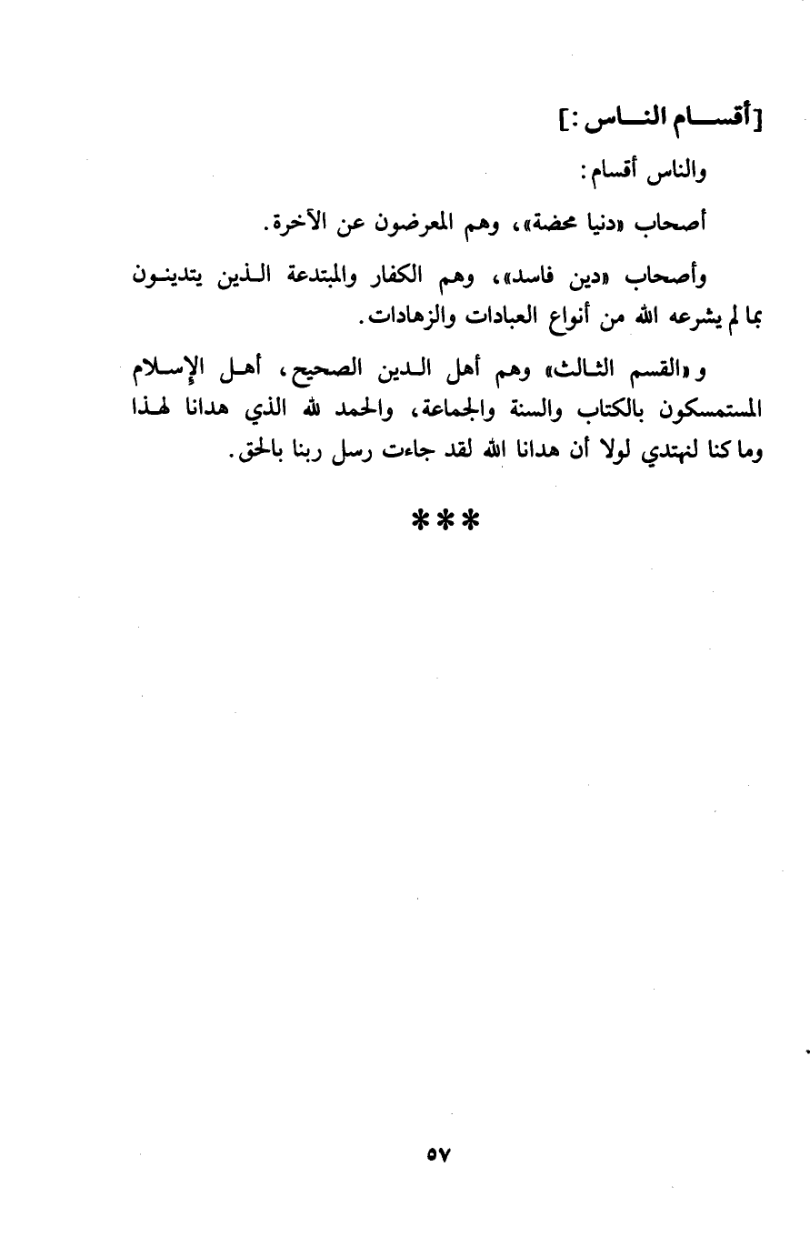 أَقسَام النَّاس وَالنَّاس أَقسَام أَصْحَاب دنيا مَحْضَة وهم المعرضون عَن الْآخِرَة وَأَصْحَاب دين فَاسد وهم الْكفَّار والمبتعدة الَّذين يتدينون بِمَا لم يشرعه الله من أَنْوَاع الْعِبَادَات والزهادات وَالْقسم الثَّالِث وهم أهل الدّين الصَّحِيح أهل الاسلام المستمسكون بِالْكتاب وَالسّنة وَالْجَمَاعَة وَالْحَمْد لله الَّذِي هدَانَا الى لهَذَا وَمَا كُنَّا لنهتدي لَوْلَا أَن هدَانَا الله لقد جَاءَت رسل رَبنَا بِالْحَقِّ