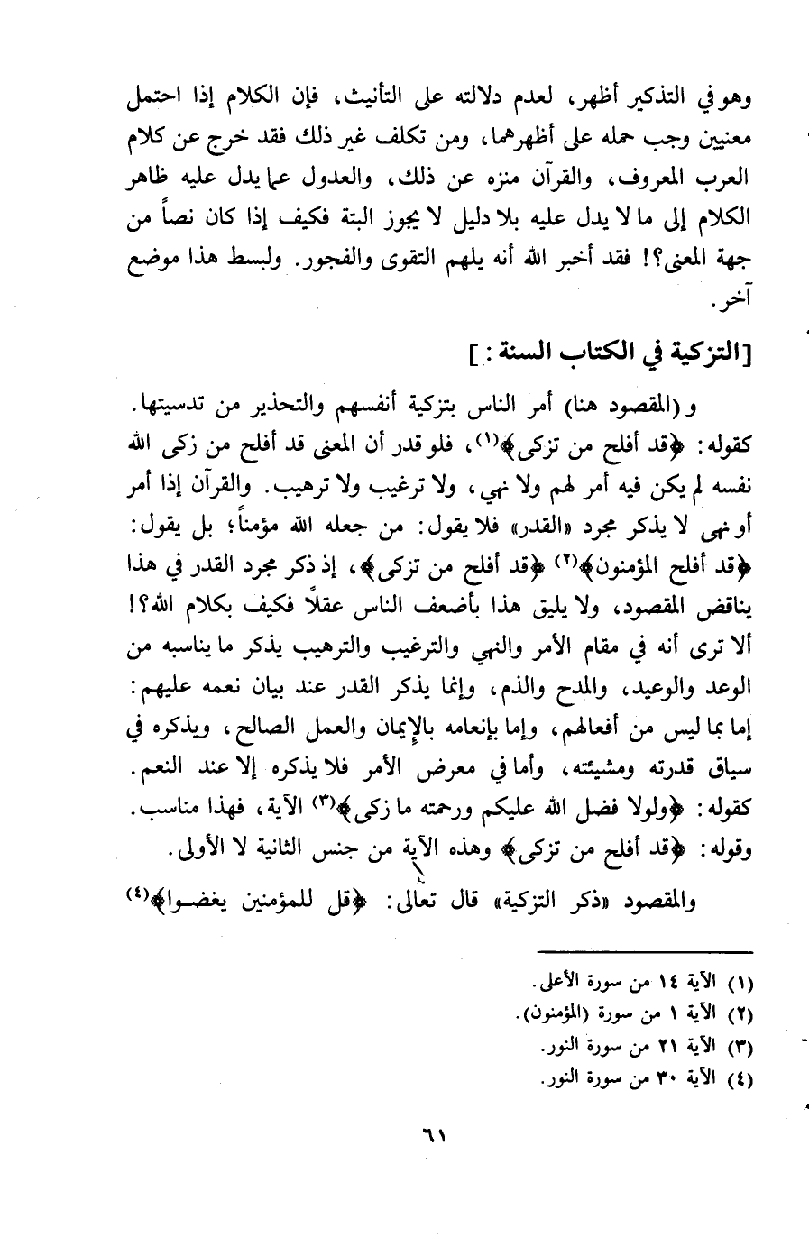 وَهُوَ فِي التَّذْكِير أظهر لعدم دلَالَته على التَّأْنِيث فان الْكَلَام اذا احْتمل مَعْنيين وَجب حمله على أظهرهمَا وَمن تكلّف غير ذَلِك فقد خرج عَن كَلَام الْعَرَب الْمَعْرُوف وَالْقُرْآن منزه عَن ذَلِك والعدول عَمَّا يدل عَلَيْهِ ظَاهر الْكَلَام الى مَا لَا يدل عَلَيْهِ بِلَا دَلِيل لَا يجوز الْبَتَّةَ فَكيف اذا كَانَ نصا من جِهَة الْمَعْنى فقد أخبر الله أَنه يلهم التَّقْوَى والفجور ولبسط هَذَا مَوضِع آخر التَّزْكِيَة فِي الْكتاب السّنة وَالْمَقْصُود هُنَا أَمر النَّاس بتزكية أنفسهم والتحذير من تدسيتها كَقَوْلِه قد أَفْلح من تزكّى فَلَو قدر أَن الْمَعْنى قد أَفْلح من زكى الله نَفسه لم يكن فِيهِ أَمر لَهُم وَلَا يُنْهِي وَلَا ترغيب وَلَا ترهيب وَالْقُرْآن اذا أَمر أَو نهى لَا يذكر مُجَرّد الْقدر فَلَا يَقُول من جعله الله مُؤمنا بل يَقُول قد أَفْلح الْمُؤْمِنُونَ قد أَفْلح من تزكّى اذ ذكر مُجَرّد الْقدر فِي هَذَا يُنَاقض الْمَقْصُود وَلَا يَلِيق هَذَا بأضعف النَّاس عقلا فَكيف بِكَلَام الله أَلا ترى أَنه فِي مقَام الْأَمر وَالنَّهْي وَالتَّرْغِيب والترهيب يذكر الْقدر عِنْد بَيَان نعمه عَلَيْهِم اما بِمَا لَيْسَ من أفعالهم وَإِمَّا بإنعامه بالايمان وَالْعَمَل الصَّالح ويذكره فِي سِيَاق قدرته ومشيئته وَأما فِي معرض الْأَمر فَلَا يذكرهُ الا عِنْد النعم كَقَوْلِه وَلَوْلَا فضل الله عَلَيْكُم وَرَحمته مَا زكى الْآيَة فَهَذَا مُنَاسِب وَقَوله قد أَفْلح من تزكّى وَهَذِه الأية من جنس الثَّانِيَة لَا الأولى وَالْمَقْصُود ذكر التَّزْكِيَة قَالَ تَعَالَى قل للْمُؤْمِنين يغضوا