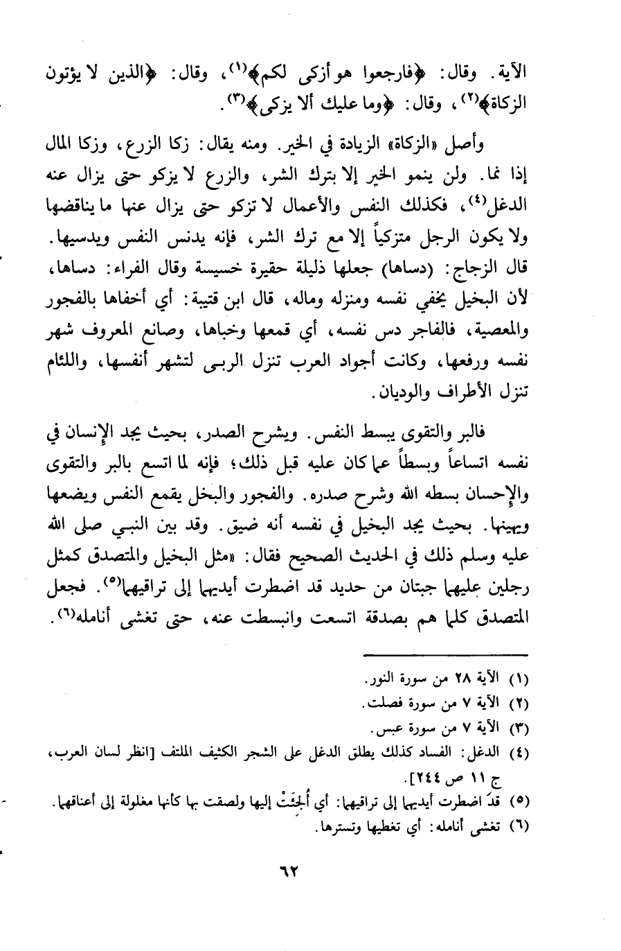 الْآيَة وَقَالَ فَارْجِعُوا هُوَ أزكى لكم وَقَالَ الَّذين لَا يُؤْتونَ الزَّكَاة وَقَالَ وَمَا عَلَيْك أَلا يزكّى وأصل الزَّكَاة الزِّيَادَة فِي الْخَيْر وَمِنْه يُقَال زكا الزَّرْع وزكا المَال اذا نما وَلنْ يَنْمُو الْخَيْر الا بترك الشَّرّ وَالزَّرْع لَا يزكو حَتَّى يزَال عَنهُ الدغل فَكَذَلِك النَّفس والأعمال لَا تزكو حَتَّى يزَال عَنْهَا مَا يناقضها وَلَا يكون الرجل متزكيا الا مَعَ ترك الشَّرّ فَإِنَّهُ يدنس النَّفس ويدسيها قَالَ الزّجاج دساها جعلهَا ذليلة حقيرة خسيسة وَقَالَ الْفراء دساها لِأَن الْبَخِيل يخفي نَفسه ومنزله وَمَاله قَالَ ابْن قُتَيْبَة أَي أخفاها بِالْفُجُورِ وَالْمَعْصِيَة فالفاجر دس نَفسه أَي قمعها وخباها وصانع الْمَعْرُوف شهر نَفسه ورفعها وَكَانَت أجواد الْعَرَب تنزل الربى لتشهر أَنْفسهَا واللئام تنزل الأطارف والوديان فالبر وَالتَّقوى يبسط النَّفس ويشرح الصَّدْر بِحَيْثُ يجد الانسان فِي نَفسه اتساعا وبساطا عَمَّا كَانَ عَلَيْهِ قبل ذَلِك فَإِنَّهُ لما اتَّسع بِالْبرِّ وَالتَّقوى والاحسان بَسطه الله وَشرح صَدره والفجور وَالْبخل يقمع النَّفس ويضعها ويهينها بِحَيْثُ يجد الْبَخِيل فِي نَفسه أَنه ضيق وَقد بَين النَّبِي صلى الله عَلَيْهِ وَسلم ذَلِك فِي الحَدِيث الصَّحِيح فَقَالَ مثل الْبَخِيل والمتصدق كَمثل رجلَيْنِ عَلَيْهِمَا جبتان من حَدِيد قد اضطرت أَيْدِيهِمَا الى تراقيهما فَجعل الْمُتَصَدّق كلما هم بِصَدقَة اتسعت وانبسطت عَنهُ حَتَّى تغشى أنامله