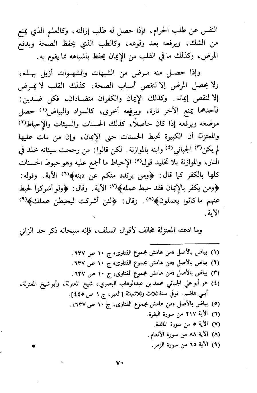 النَّفس على طلب الْحَرَام فَإِذا حصل لَهُ طلب ازالته وكالعلم الَّذِي يمْنَع من الشَّك وَيَرْفَعهُ بعد وُقُوعه وكالطلب الَّذِي يحفظ الصِّحَّة ويدع الْمَرَض وَكَذَلِكَ مَا فِي الْقلب من الايمان يحفظ بأشباهه مِمَّا يقوم بِهِ واذا حصل مِنْهُ مرض من الشُّبُهَات والشهوات أزيل بِهَذِهِ وَلَا يحصل الْمَرَض الا لنَقص أَسبَاب الصِّحَّة كَذَلِك الْقلب لَا يمرض الا لنَقص ايمانه وَكَذَلِكَ الايمان والكفران متضادان فَكل ضدين فأحدهما يمْنَع الآخر تَارَة وَيَرْفَعهُ أُخْرَى كالسواد وَالْبَيَاض حصل مَوْضِعه وَيَرْفَعهُ اذا كَانَ حَاصِلا كَذَلِك الْحَسَنَات والسيئات والاحباط والمعتزلة أَن الْكَبِيرَة تحبط الْحَسَنَات حَتَّى الايمان وان من مَاتَ عَلَيْهَا لم يكن الجبائي وَابْنه بالموازنة لَكِن قَالُوا من رجحت سيئاته خلد فِي النَّار والموازنة بِلَا تخليد قَول الاحباط مَا أجمع عَلَيْهِ وَهُوَ حبوط الْحَسَنَات كلهَا بالْكفْر كَمَا قَالَ وَمن يرتدد مِنْكُم عَن دينه الْآيَة وَقَوله وَمن يكفر بالايمان فقد حَبط عمله الْآيَة وَقَالَ وَلَو أشركوا الحبط عَنْهُم مَا كَانُوا يعْملُونَ وَقَالَ لَئِن أشركت ليحبطن عَمَلك الْآيَة وَمَا ادَّعَتْهُ الْمُعْتَزلَة مُخَالف لأقوال السّلف فَإِنَّهُ سُبْحَانَهُ ذكر حد الزَّانِي