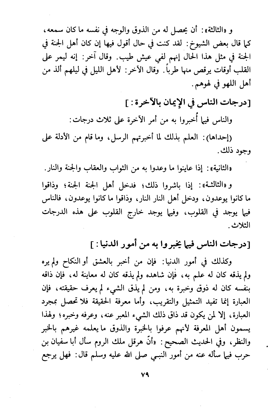 وَالثَّالِثَة أَن يحصل لَهُ من الذَّوْق وَالْوَجْه فِي نَفسه مَا كَانَ سَمعه كَمَا قَالَ بعض الشُّيُوخ لقد كنت فِي حَال أَقُول فِيهَا ان كَانَ أهل الْجنَّة فِي الْجنَّة فِي مثل هَذَا الْحَال انهم لفي عَيْش طيب وَقَالَ آخر انه ليمر على الْقلب أَوْقَات يرقص مِنْهَا طَربا وَقَالَ الآخر لأهل اللَّيْل فِي ليلهم ألذ من أهل اللَّهْو فِي لهوهم دَرَجَات النَّاس فِي الايمان بِالآخِرَة وَالنَّاس فِيمَا أخبروا بِهِ من أَمر الْآخِرَة على ثَلَاث دَرَجَات احداها الْعلم بذلك لما أَخْبَرتهم الرُّسُل وَمَا قَامَ من الْأَدِلَّة على وجود ذَلِك الثَّانِيَة اذا عاينوا مَا وعدوا بِهِ من الثَّوَاب وَالْعِقَاب وَالْجنَّة وَالنَّار وَالثَّالِثَة اذا باشروا ذَلِك فَدخل أهل الْجنَّة الْجنَّة وذاقوا مَا كَانُوا يوعدون وَدخل أهل النَّار النَّار وذاقوا مَا كَانُوا يوعدون فَالنَّاس فِيمَا يُوجد فِي الْقُلُوب وَفِيمَا يُوجد خَارج الْقُلُوب على هَذِه الدَّرَجَات الثَّلَاث دَرَجَات النَّاس فِيمَا يخبروا بن من أُمُور الدُّنْيَا وَكَذَلِكَ فِي أُمُور الدُّنْيَا فان من أخبر بالعشق أَو النِّكَاح وَلم يره وَلم يذقه كَانَ لَهُ علم بِهِ فان شَاهده وَلم يذقه كَانَ لَهُ مُعَاينَة لَهُ فَإِن ذاقه بِنَفسِهِ كَانَ لَهُ ذوق وخبرة بِهِ وَمن لم يذقْ الشَّيْء لم يعرف حَقِيقَته فان الْعبارَة انما تفِيد التَّمْثِيل والتقريب وَأما معرفَة الْحَقِيقَة فَلَا تحصل بِمُجَرَّد الْعبارَة الا لمن يكون قد ذاق ذَلِك الشَّيْء الْمعبر عَنهُ وعرفه وَخَبره وَلِهَذَا يسمون أهل الْمعرفَة لأَنهم عرفُوا بالخبرة والذوق مَا يُعلمهُ غَيرهم بالْخبر وَالنَّظَر وَفِي الحَدِيث الصَّحِيح أَن هِرقل ملك الرّوم سَأَلَ أَبَا سُفْيَان بن حَرْب فِيمَا سَأَلَهُ عَنهُ من أُمُور النَّبِي صلى الله عَلَيْهِ وَسلم قَالَ فَهَل يرجع