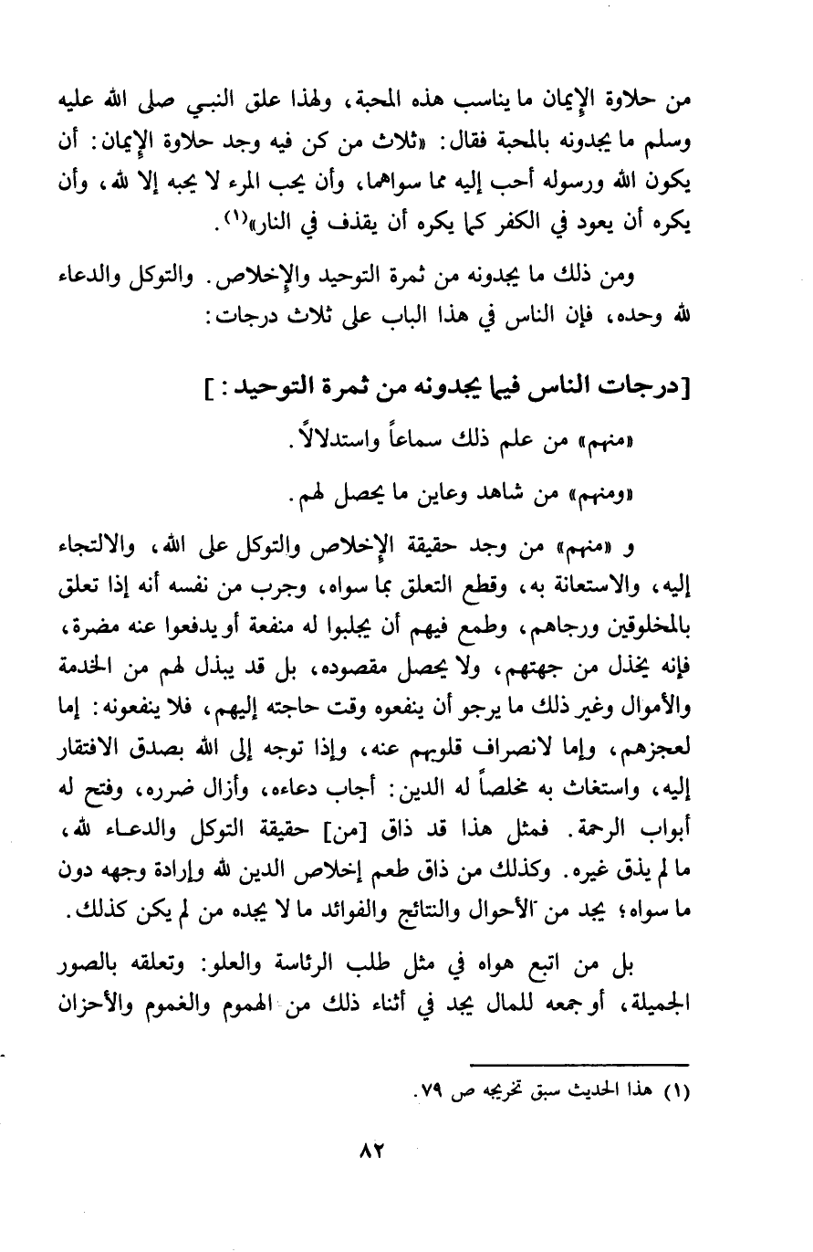 من حلاوة الايمان مَا يُنَاسب هَذِه الْمحبَّة وَلِهَذَا علق النَّبِي صلى الله عَلَيْهِ وَسلم مَا يجدونه بالمحبة فَقَالَ ثَلَاث من كن فِيهِ وجد حلاوة الايمان أَن يكون الله وَرَسُوله أحب اليه مِمَّا سواهُمَا وَأَن يحب الْمَرْء لَا يُحِبهُ الا لله وَأَن يكره أَن يعود فِي الْكفْر كَمَا يكره أَن يقذف فِي النَّار وَمن ذَلِك مَا يجدونه من ثَمَرَة التَّوْحِيد والاخلاص والتوكل وَالدُّعَاء لله وَحده فَإِن النَّاس فِي هَذَا الْبَاب على ثَلَاث دَرَجَات دَرَجَات النَّاس فيا يجدونه من ثَمَرَة التَّوْحِيد مِنْهُم من علم ذَلِك سَمَاعا واستدلالا وَمِنْهُم من شَاهد وعاين مَا يحصل لَهُم وَمِنْهُم من وجد حَقِيقَة الاخلاص والتوكل على الله والالتجاء اليه والاستعانة بِهِ وَقطع التَّعَلُّق بِمَا سواهُ وجرب من نَفسه أَنه اذا تعلق بالمخلوقين ورجاهم وطمع فيهم أَن يجلبوا لَهُ مَنْفَعَة أَو يدفعوا عَنهُ مضرَّة فَإِنَّهُ يخذل من جهتهم وَلَا يحصل مَقْصُوده بل قد يبْذل لَهُم من الْخدمَة وَالْأَمْوَال وَغير ذَلِك مَا يَرْجُو أَن ينفعوه وَقت حَاجته اليهم فَلَا ينفعونه اما لعجزهم واما لانصارف قُلُوبهم عَنهُ واذا توجه الى الله بِصدق الافتقار اليه واستغاث بِهِ مخلصا لَهُ الدّين أجَاب دعاءه وأزال ضَرَره وَفتح لَهُ أَبْوَاب الرَّحْمَة فَمثل هَذَا قد ذاق من حَقِيقَة التَّوَكُّل وَالدُّعَاء لله مَا لم يدق غَيره وَكَذَلِكَ من ذاق طعم إخلاص لله وارادة وَجهه دون مَا سواهُ يجد من الْأَحْوَال والنتائج والفوائد مَا لَا يجده من لم يكن كَذَلِك بل من اتبع هَوَاهُ فِي مثل طلب الرِّئَاسَة والعلو وتعلقه بالصور الجميلة أَو جمعه لِلْمَالِ يجد فِي أثْنَاء ذَلِك من الهموم والغموم وَالْأَحْزَان