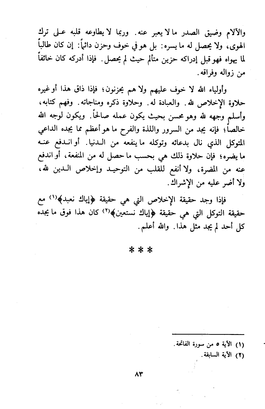 والآلام وضيف الصَّدْر مَا لَا يعبر عَنهُ وَرُبمَا لَا يطاوعه قلبه على ترك الْهوى وَلَا يحصل لَهُ مَا يسره بل هُوَ فِي خوف وحزن دَائِما ان كَانَ طَالبا لما يهواه فَهُوَ قبل ادراكه حَزِين متألم حَيْثُ لم يحصل فَإِذا أدْركهُ كَانَ خَائفًا من زَوَاله وفراقه وأولياء الله لَا خوف عَلَيْهِم وَلَا هم يَحْزَنُونَ فَإِذا ذاق هَذَا أَو غَيره حلاوة الاخلاص لله وَالْعِبَادَة وحلاوة ذكره ومناجاته وَفهم كِتَابه وَأسلم وَجهه لله وَهُوَ محسن بِحَيْثُ يكون عمله صَالحا وَيكون لوجه الله خَالِصا فَإِنَّهُ يجد من السرُور واللذة والفرح مَا هُوَ أعظم مِمَّا يجده الدَّاعِي المتَوَكل الَّذِي نَالَ بدعائه وتوكله مَا يَنْفَعهُ من الدُّنْيَا أَو انْدفع عَنهُ مَا يضرّهُ فَإِن حلاوة ذَلِك هِيَ بِحَسب مَا حصل لَهُ من الْمَنْفَعَة أَو انْدفع عَنهُ من الْمضرَّة وَلَا أَنْفَع للقلب من التَّوْحِيد واخلاص الدّين لله وَلَا أضرّ عَلَيْهِ من الاشراك فَإِذا وجد حَقِيقَة الاخلاص الَّتِي هِيَ حَقِيقَة اياك نعبدمع حَقِيقَة التَّوَكُّل الَّتِي هِيَ حَقِيقَة اياك نستعين كَانَ هَذَا فَوق مَا يجده كل أحد لم يجد مثل هَذَا وَالله أعلم