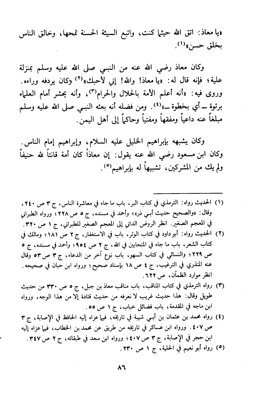 يَا معَاذ اتَّقِ الله حَيْثُمَا كنت وَاتبع السَّيئَة الْحَسَنَة تمحها وخالق النَّاس بِخلق حسن وَكَانَ معَاذ رَضِي الله عَنهُ من النَّبِي صلى الله عَلَيْهِ وَسلم بِمَنْزِلَة عَلَيْهِ فَإِنَّهُ قَالَ لَهُ يَا معَاذ وَالله اني لَأحبك وَكَانَ يردفه وَرَاءه وروى فِيهِ أَنه أعلم الْأمة بالحلال وَالْحرَام وَأَنه يحْشر أَمَام الْعلمَاء برتوة أَي بخطوة وَمن فَضله أَنه بَعثه النَّبِي صلى الله عَلَيْهِ وَسلم مبلغا عَنهُ دَاعيا ومفقها ومفتيا وحاكما الى أهل الْيمن وَكَانَ يُشبههُ بإبراهيم الْخَلِيل عَلَيْهِ السَّلَام وَإِبْرَاهِيم امام النَّاس وَكَانَ ابْن مَسْعُود رَضِي الله عَنهُ يَقُول ان معَاذًا كَانَ أمة قَانِتًا لله حَنِيفا وَلم يَك من الْمُشْركين تَشْبِيها لَهُ بإبراهيم