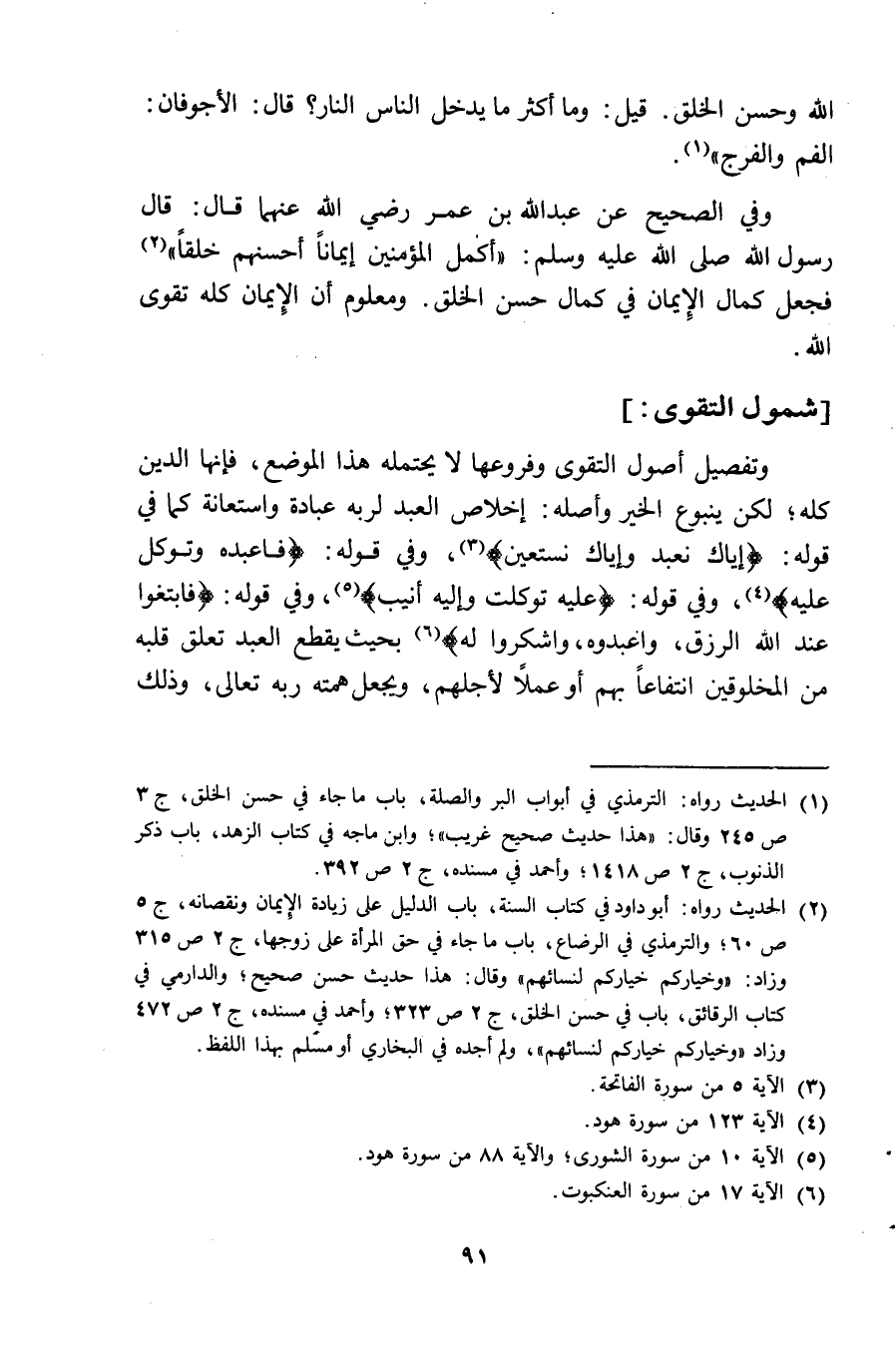 الله وَحسن الْخلق قيل وَمَا أَكثر مَا يدْخل النَّاس النَّار قَالَ الأجوفان الْفَم والفرج وَفِي الصَّحِيح عَن عبد الله بن عمر رَضِي الله عَنْهُمَا قَالَ قَالَ رَسُول الله صلى الله عَلَيْهِ وَسلم أكمل الْمُؤمنِينَ اسيمانا أحْسنهم خلقا فَجعل كَمَال الايمان فِي كَمَال حسن الْخلق وَمَعْلُوم أَن الايمان كُله تقوى الله شُمُول التَّقْوَى وتفصيل أصُول التَّقْوَى وفروعها لَا يحْتَملهُ هَذَا الْموضع فَإِنَّهَا الدّين كُله لَكِن ينبوع الْخَيْر وَأَصله اخلاص العَبْد لرَبه عبَادَة واستعانة كَمَا فِي قَوْله اياك نعْبد واياك نستعين وَفِي قَوْله فاعبده وتوكل عَلَيْهِ وَفِي قَوْله عَلَيْهِ توكلت واليه أنيب وَفِي قَوْله فابتغو عِنْد الله الرزق واعبدوه واشكروا لَهُ بِحَيْثُ يقطع العَبْد تعلق قلبه من المخلوقين انتفاعا بهم عملا لأجلهم وَيجْعَل همته ربه تَعَالَى وَذَلِكَ