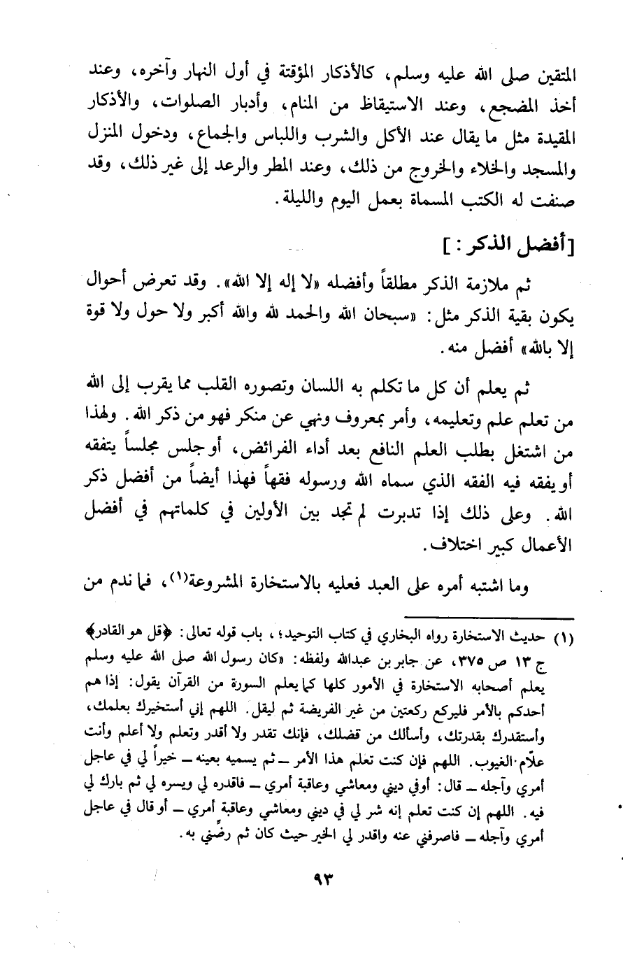 الْمُتَّقِينَ صلى الله عَلَيْهِ وَسلم كالأذكار المؤقتة فِي أول النَّهَار وَآخره وَعند أَخذ المضجع وَعند الاستيقاظ من الْمَنَام وأدبار الصَّلَوَات والأذكار الْمقيدَة مثل مَا يُقَال عِنْد الْأكل وَالشرب واللباس وَالْجِمَاع وَدخُول الْمنزل وَالْمَسْجِد والخلاء وَالْخُرُوج من ذَلِك وَعند الْمَطَر والرعد الى غير ذَلِك وَقد صنفت لَهُ الْكتب الْمُسَمَّاة بِعَمَل الْيَوْم وَاللَّيْلَة أفضل الذّكر ثمَّ مُلَازمَة الذّكر مُطلقًا وأفضله لَا اله الا الله وَقد تعرض أَحْوَال يكون بَقِيَّة الذّكر مثل سُبْحَانَ الله وَالْحَمْد لله وَالله أكبر وَلَا حول وَلَا قُوَّة الا بِاللَّه أفضل مِنْهُ ثمَّ يعلم أَن كل مَا تكلم بِهِ اللِّسَان وتصوره الْقلب مِمَّا يقرب الى الله من تعلم علم وتعليمه وَأمر بِمَعْرُوف وَنهي عَن مُنكر فَهُوَ من ذكر الله وَلِهَذَا من اشْتغل بِطَلَب الْعلم النافع بعد أَدَاء الْفَرَائِض أَو جلس مَجْلِسا يتفقه أَو يفقه فِيهِ الْفِقْه الَّذِي سَمَّاهُ الله وَرَسُوله فقها فَهَذَا أَيْضا من أفضل ذكر الله وعَلى ذَلِك اذا تدبرت لم تَجِد بَين الْأَوَّلين فِي كلماتهم فِي أفضل الْأَعْمَال كَبِير اخْتِلَاف وَمَا اشْتبهَ أمره على العَبْد فَعَلَيهِ بالاستخارة الْمَشْرُوعَة فَمَا نَدم من