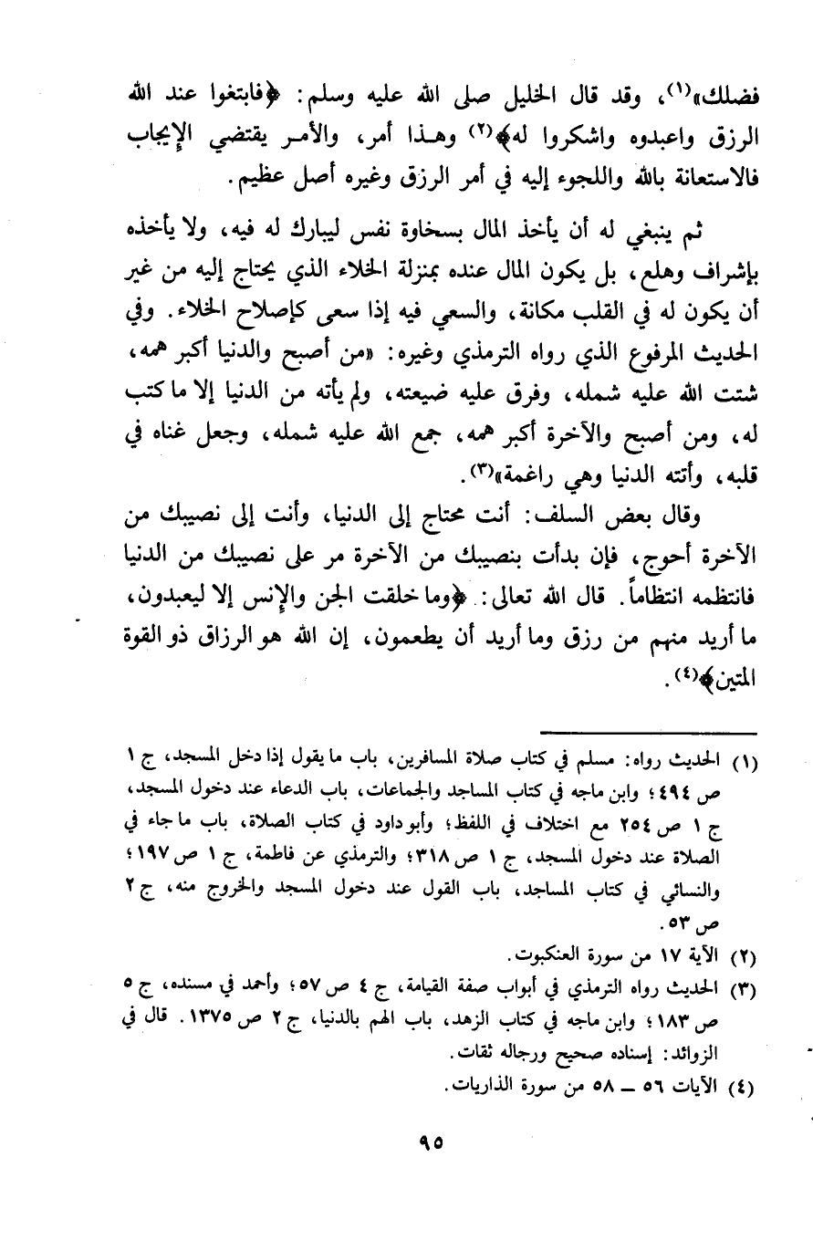 فضلك وَقد قَالَ الْخَلِيل صلى الله عَلَيْهِ وَسلم فابتغوا عِنْد الله الزرق واعبدوه واشكروا لَهُ وَهَذَا أَمر وَالْأَمر يَقْتَضِي الايجاب فالاستعانة بِاللَّه واللجوء اليه فِي أَمر الرزق وَغَيره أصل عَظِيم ثمَّ يَنْبَغِي لَهُ أَن يَأْخُذ المَال بسخاوة نفس ليبارك لَهُ فِيهِ وَلَا يَأْخُذهُ بإشراف وهلع بل يكون المَال عِنْده بِمَنْزِلَة الْخَلَاء الَّذِي يحْتَاج اليه من غير أَن يكون لَهُ فِي الْقلب مكانة وَالسَّعْي فِيهِ اذا سعى كاصلاح الْخَلَاء وَفِي الحَدِيث الْمَرْفُوع الَّذِي رَوَاهُ التِّرْمِذِيّ وَغَيره من أصبح وَالدُّنْيَا أكبر همه شتت الله عَلَيْهِ شَمله وَفرق عَلَيْهِ ضيعته وَلم يَأْته من الدُّنْيَا الا ماكتب لَهُ وَمن أصبح والأخرة أكبر همه جمع الله عَلَيْهِ شَمله وَجعل غناهُ فِي قلبه وأتته الدُّنْيَا وَهِي راغمة وَقَالَ بعض السّلف أَنْت مُحْتَاج الى الدُّنْيَا وَأَنت الى نصيبك من الْآخِرَة أحْوج فَإِن بدأت بنصيبك من الْآخِرَة مر على نصيبك من الدُّنْيَا فانتظمه انتظاما قَالَ الله تَعَالَى وَمَا خلقت الْجِنّ والانس الا ليعبدون مَا أُرِيد مِنْهُم من رزق وَمَا أُرِيد أَن يطْعمُون ان الله وَهُوَ الرَّزَّاق ذُو الْقُوَّة المتين