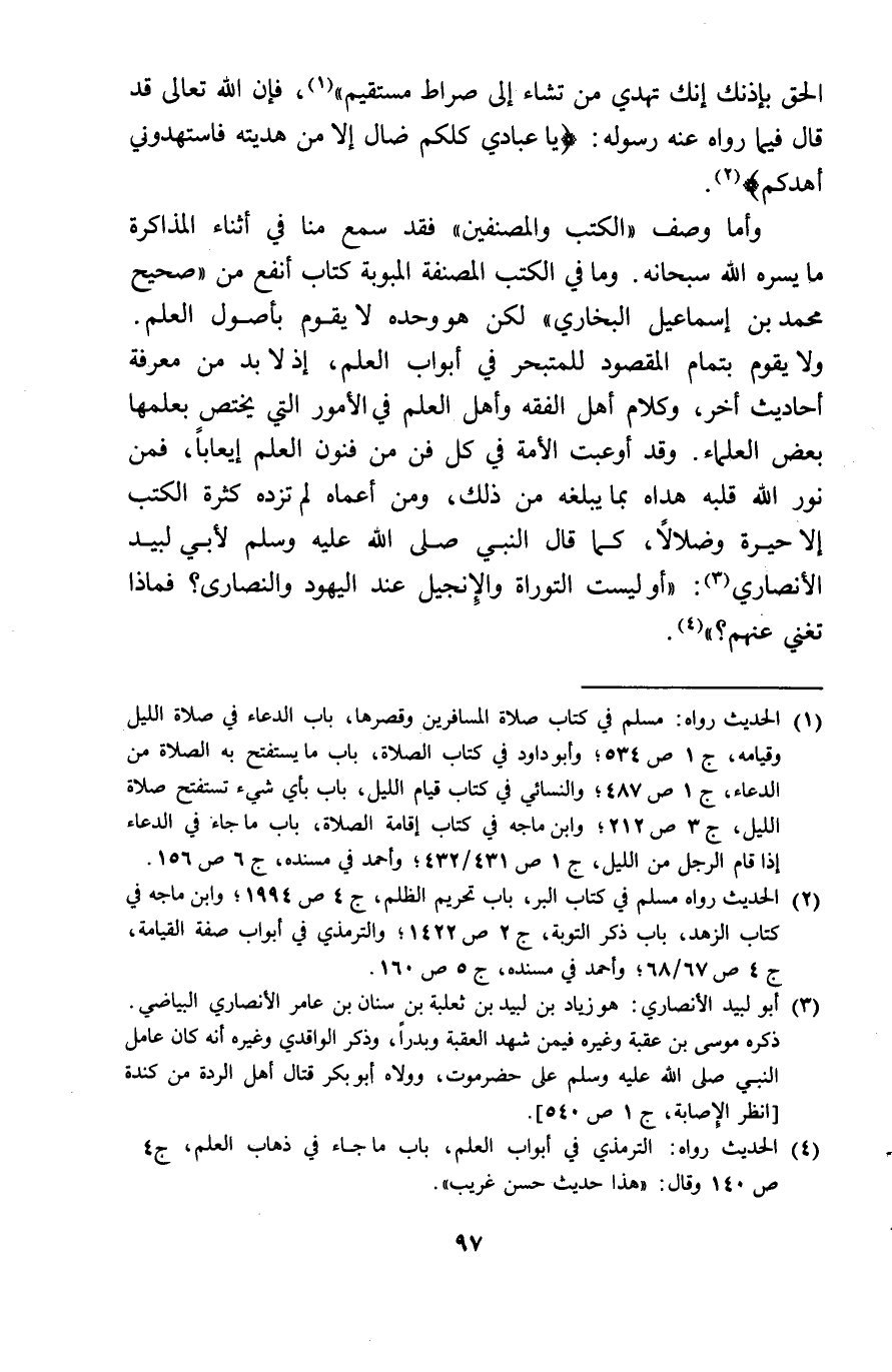 الْحق باذنك انك نهدي من تشَاء الى صِرَاط مُسْتَقِيم فَإِن الله تَعَالَى قد قَالَ فِيمَا رَوَاهُ عَنهُ رَسُوله يَا عبَادي كلكُمْ ضال الا من هديته فاستهدوني أهدكم وَأما وصف الْكتب والمصنفين فقد سمع منا فِي أثْنَاء المذاكرة مَا يسره الله سُبْحَانَهُ وَمَا فِي الْكتب المصنفة المبوبة كتاب أَنْفَع من صَحِيح مُحَمَّد بن اسماعيل البُخَارِيّ لَكِن هُوَ وَحده لَا يقوم بأصول الْعلم وَلَا يَقُول بِتمَام الْمَقْصُود للمتبحر فِي أَبْوَاب الْعلم اذ لَا بُد من معرفَة أَحَادِيث أخر وَكَلَام أهل الْفِقْه وَأهل الْعلم فِي الْأُمُور الَّتِي يخْتَص بعلمها بعض الْعلمَاء وَقد أوعبت الْأمة فِي كل فن من فنون الْعلم ايعابا فَمن نور الله قلبه هداه بِمَا يبلغهُ من ذَلِك وَمن أعماه لم تزِدْه كَثْرَة الْكتب الا حيرة وضلالا كَمَا قَالَ النَّبِي صلى الله عَلَيْهِ وَسلم لأبي لبيد الْأنْصَارِيّ أَو لَيست التَّوْرَاة والأنجيل عِنْد الْيَهُود وَالنَّصَارَى فَمَاذَا تغني عَنْهُم
