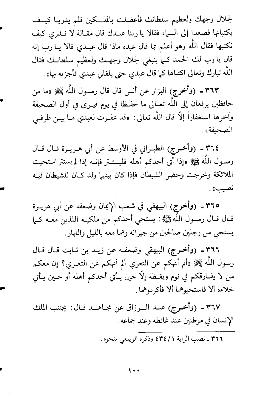 وأخرج البيهقي في شعب الإيمان وضعفه عن زيد بن ثابت قال: قال رسول الله صلى الله عليه وسلم:) ألم أنهكم عن التعري، ألم أنهكم عن التعري؟ إن معكم من لا يفارقكم في نوم ويقظة إلا حين يأتي أحدكم أهله أو حين يأتي خلاءه، ألا فاستحيوهما، ألا فأكرموهما (.