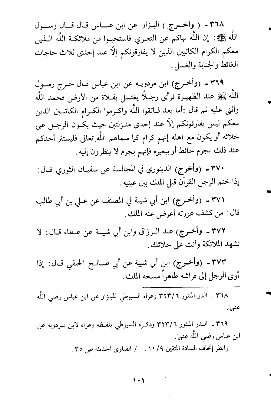 وأخرج البزار عن ابن عباس قال: قال رسول الله صلى الله ليه وسلم:) إن الله نهاكم عن التعري، فاستحيوا من ملائكة الله الذين معكم الكرام الكاتبين الذين لا يفارقونكم إلا عند إحدى ثلاث حاجات: الغائط، والجنابة، والغسل (.