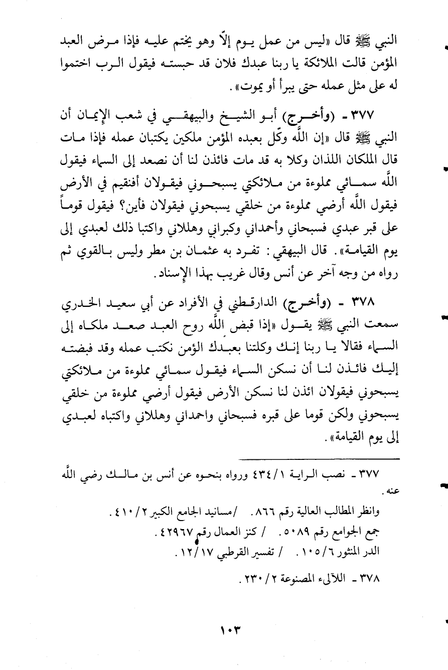 وأخرج أبو الشيخ والبيهقي في شعب الإيمان أن النبي صلى الله عليه وسلم:) إن الله وكل بعبده المؤمن ملكين يكتبان عمله فإذا مات قال الملكان اللذان وكلا به: قد مات فائذن لنا أن نصعد إلى السماء فيقول الله: سمائي مملوءة من ملائكتي يسبحوني فيقولان: أفنقيم في الأرض؟ فيقول الله: أرضي مملوءة من خلقي يسبحوني فيقولان: فأين؟ فيقول: قوما على قبر عبدي فسبحاني واحمداني وكبراني وهللاني واكتبا ذلك لعبدي إلى يوم القيامة (. قال البيهقي: تفرد به عثمان بن مطر وليس بالقوى، ثم رواه من وجه آخر عن أنس وقال: غريب بهذا الإسناد.