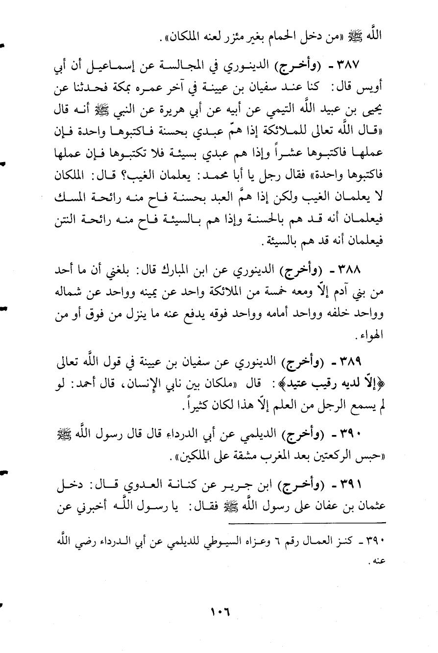 وأخرج الدينوري في المجالسة عن إسماعيل بن أبي أويس قال: كنا عند سفيان بن عيينة في آخر عمره بمكة فحدثنا عن يحيى بن عبيد الله التيمي عن أبيه عن أبي هريرة عن النبي صلى الله عليه وسلم أنه قال:) قال الله تعالى للملائكة: إذا هم عبدي بحسنة فاكتبوها واحدة، فإن عملها فاكتبوها عشرا، وإذا هم عبدي بسيئة فلا تكتبوها، فإن عملها فاكتبوها واحدة (. فقال رجل يا أبا محمد يعلمان الغيب؟ قال: الملكان لا يعلمان الغيب ولكن إذا هم العبد بحسنة فاح منه رائحة المسك فيعلمان أنه قد هم بالحسنة، وإذا هم بالسيئة فاح منه رائحة النتن فيعلمان أنه قد هم بالسيئة.