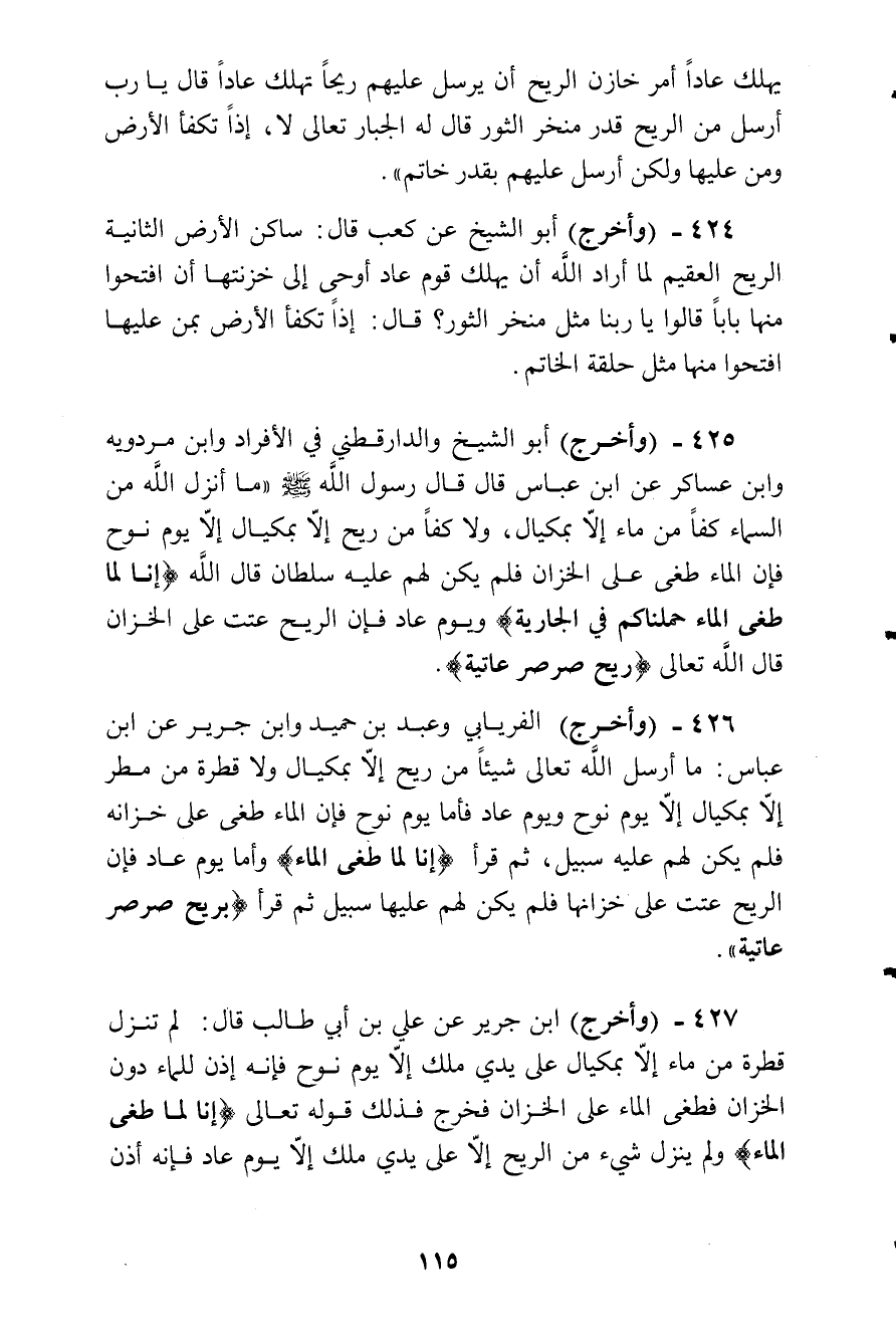 يهلك عاد أمر خازن الريح أن يرسل عليهم ريحا تهلك عادا قال: يا رب أرسل من الريح قدر منخر الثور قال له الجبار تعالى: لا، إذا تكفأ الأرض ومن عليها ولكن أرسل عليهم بقدر خاتم (.