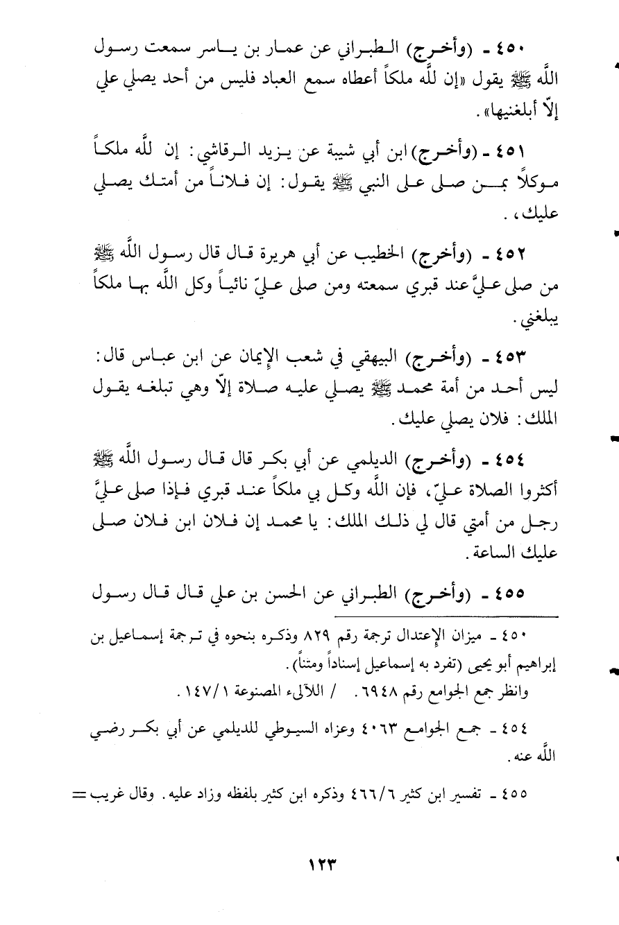 وأخرج الطبراني عن عمار بن ياسر سمعت رسول الله صلى الله عليه وسلم يقول:) إن لله ملكا أعطاه سمع العباد فليس من أحد يصلي على إلا أبلغنيها (.