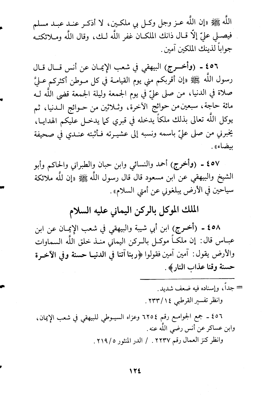وأخرج أحمد والنسائي وابن حبان والطبراني والحاكم وأبو الشيخ والبيهقي عن ابن مسعود قال: قال رسول الله صلى الله عليه وسلم:) إن لله ملائكة سياحين في الأرض يبلغوني عن أمتي السلام (.