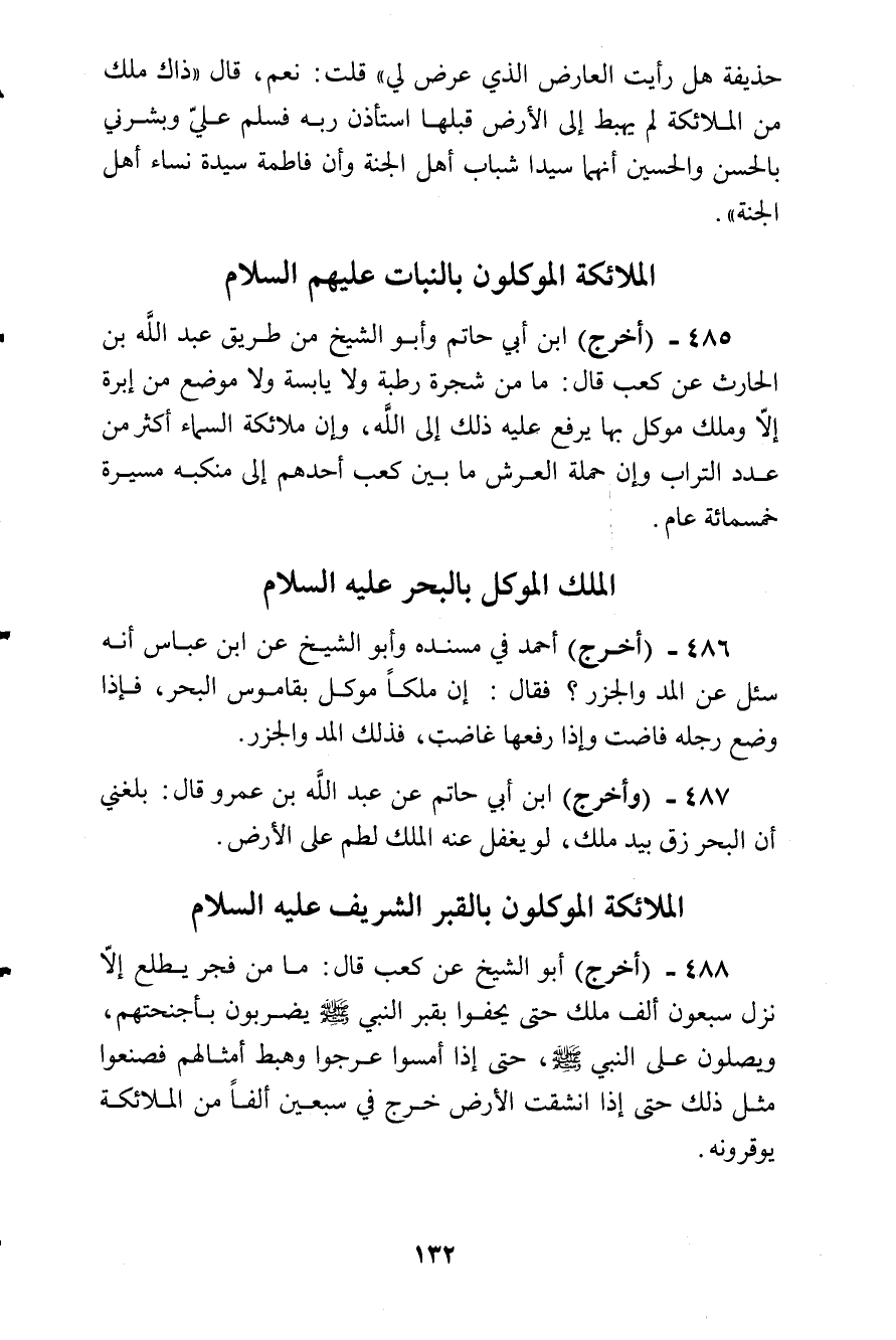 أخرج ابن أبي حاتم وأبو الشيخ من طريق عبد الله بن الحارث عن كعب قال:) ما من شجرة رطبة ولا يابسة ولا موضع من إبرة إلا وملك موكل بها يرفع عليه ذلك إلى الله، وإن ملائكة السماء أكثر من عدد التراب وإن حملة العرش ما بين كعب أحدهم إلى منكبه مسيرة خمسمائة عام (.