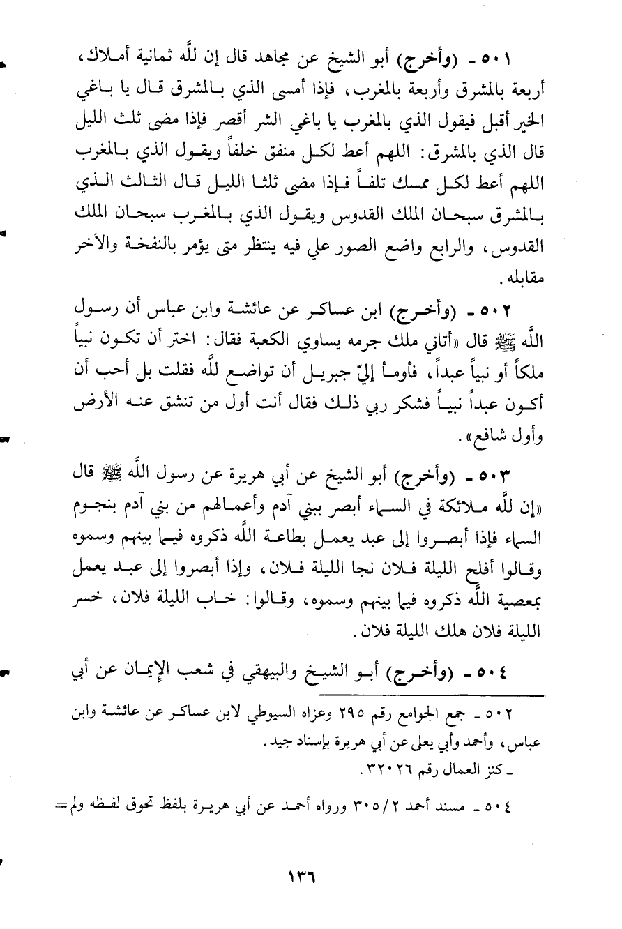 وأخرج أبو الشيخ عن مجاهد قال: إن لله ثمانية أملاك، أربعة بالمشرق وأربعة بالمغرب، فإذا أمسى الذي بالمشرق قال: يا باغي الخير أقبل، فيقول الذي بالمغرب: يا باغي الشر أقصر، فإذا مضى ثلث الليل قال الذي بالمشرق: اللهم أعط لكل منفق خلفا ويقول الذي بالمغرب: اللهم أعط لكل ممسك تلفا فإذا مضى ثلثا الليل قال الثالث الذي بالمشرق: سبحان الملك القدوس ويقول الذي بالمغرب: سبحان الملك القدوس، والرابع واضع الصور على فيه ينتظر متى يؤمر بالنفخة والآخر مقابلة.