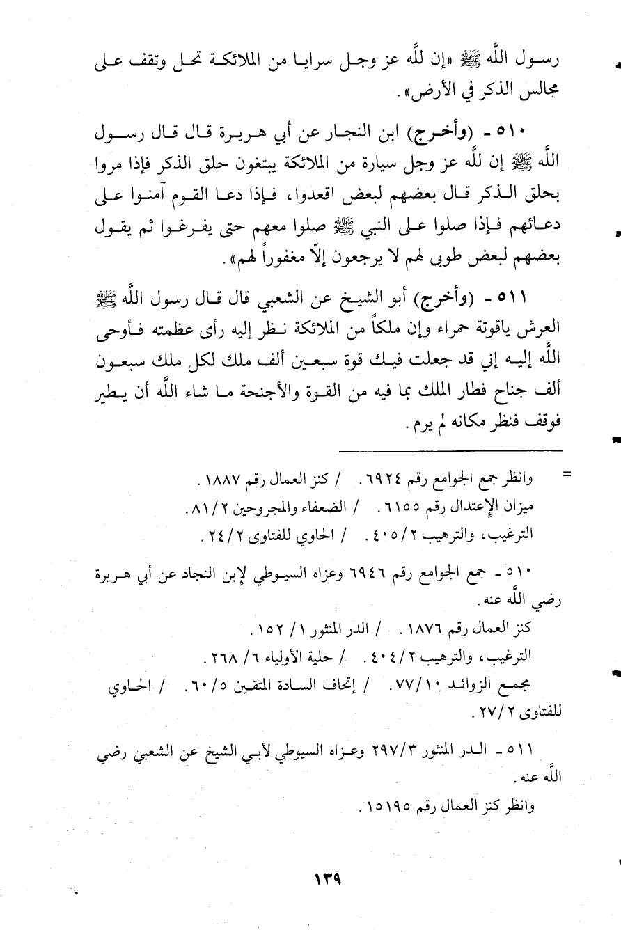 وأخرج ابن النجار عن أبي هريرة قال: قال رسول الله صلى الله عليه وسلم:) إن لله عز وجل سيارة من الملائكة يبتغون حلق الذكر، فإذا مروا بحلق الذكر قال بعضهم لبعض: اقعدوا، فإذا دعا القوم أمنوا على دعائهم، فإذا صلوا على النبي صلى الله عليه وسلم صلوا معهم حتى يفرغوا ثم يقول بعضهم لبعض: طوبى لهم لا يرجعون إلا مغفورا لهم (.
