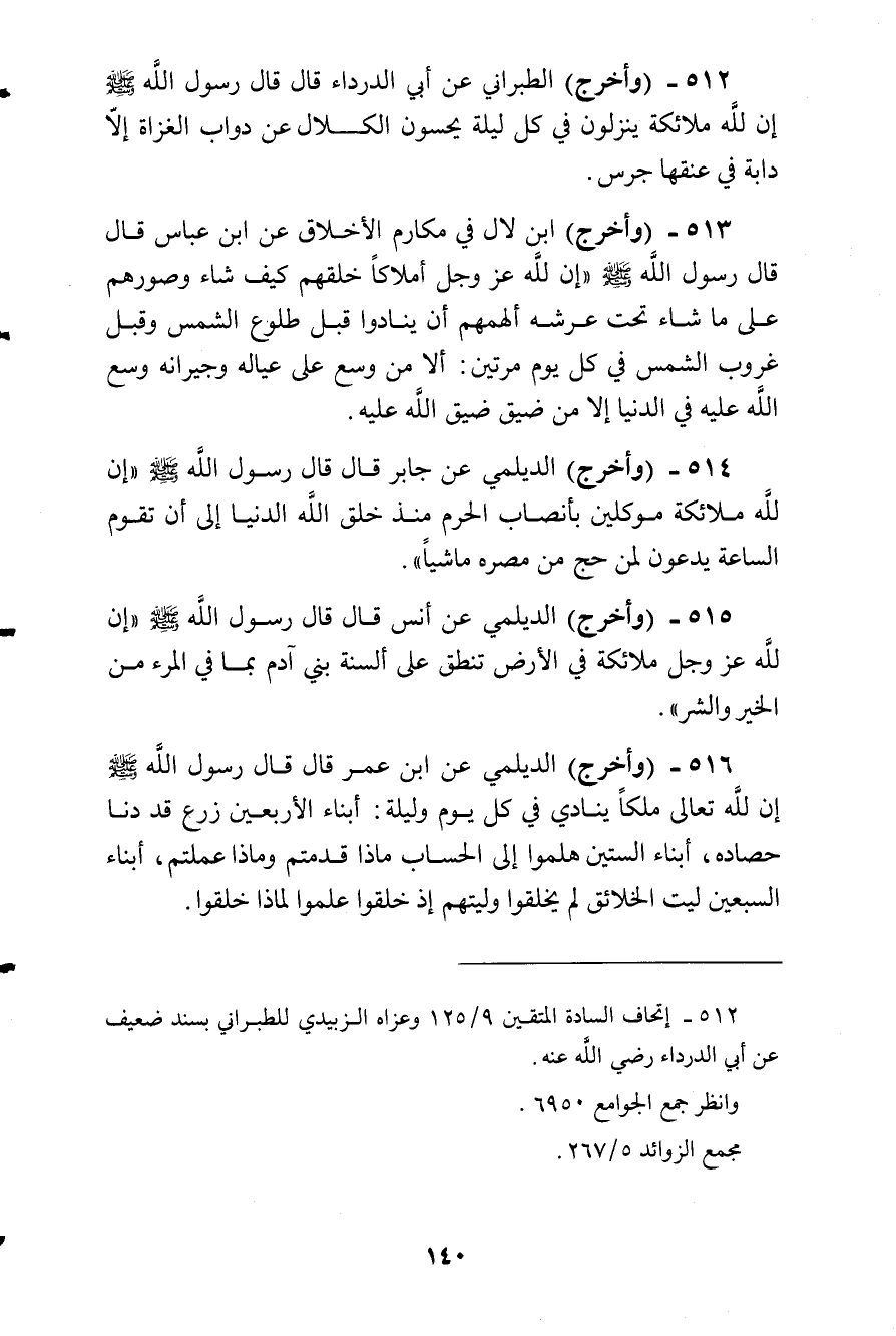 وأخرج الطبراني عن أبي الدرداء قال: قال رسول الله صلى الله عليه وسلم:) إن لله ملائكة ينزلون في كل ليلة يحسون الكلال عن دواب الغزاة إلا دابة في عنقها جرس (.