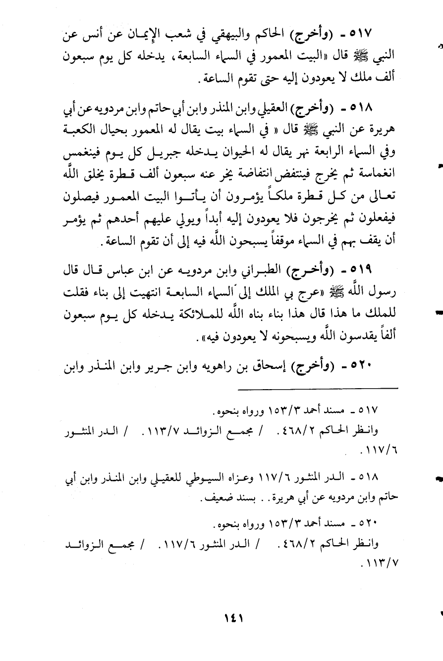 وأخرج العقيلثي وابن المنذر وابن أبي حاتم وابن مردويه عن أبي هريرة عن النبي صلى الله عليه وسلم قال:) في السماء بيت يقال له البيت المعمور بحيال الكعبة، وفي السماء الرابعة نهر يقال له الحيوان يدخله جبريل كل يوم فينغمس انغماسة ثم يخرج فينتفض انتفاضة يخر عنه سبعون ألف قطرة، يخلق الله تعالى من كل قطرة ملكا، يؤمرون أن يأتوا البيت المعمور فيصلون فيفعلون ثم يخرجون فلا يعودون إليه أبدان ويولي عليهم.