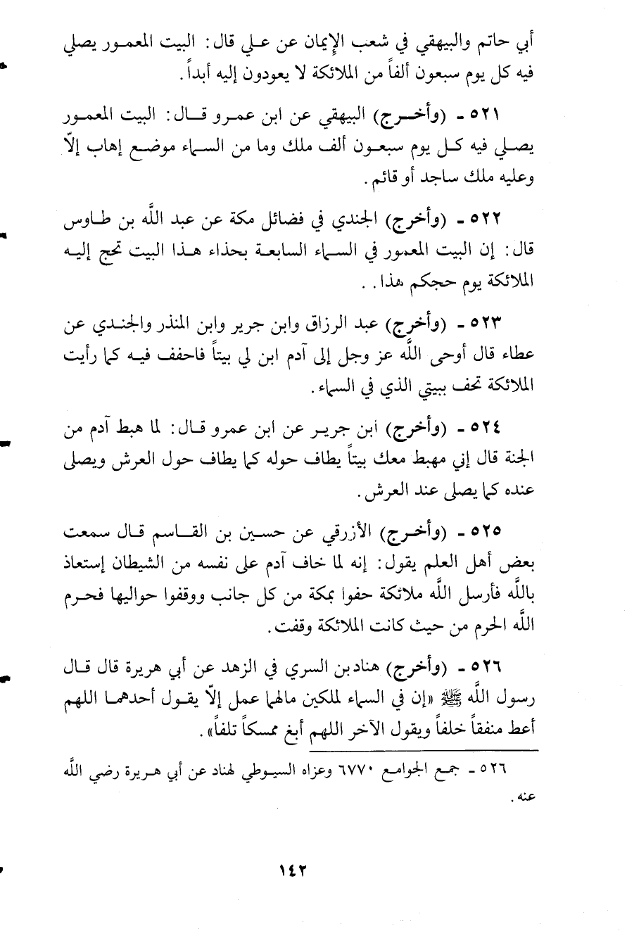 وأخرج الجندي في فضائل مكة عن عبد الله بن طاوس قال: إن البيت المعمور في السماء السابعة بحذاء هذا البيت تحج إليه الملائكة يوم حجكم هذا.