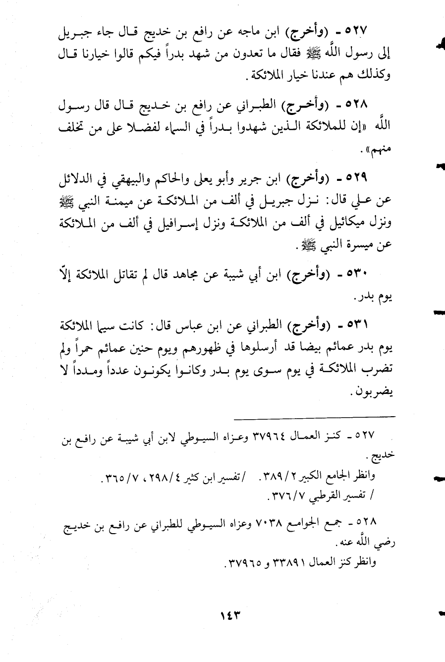 وأخرج ابن ماجه عن رافع بن خديج قال: جاء جبريل إلى رسول الله صلى الله عليه وسلم فقال:) ما تعدون من شهد بدرا فيكم؟ قالوا: خيارنا، قال: وكذلك هم عندنا خيار الملائكة (.