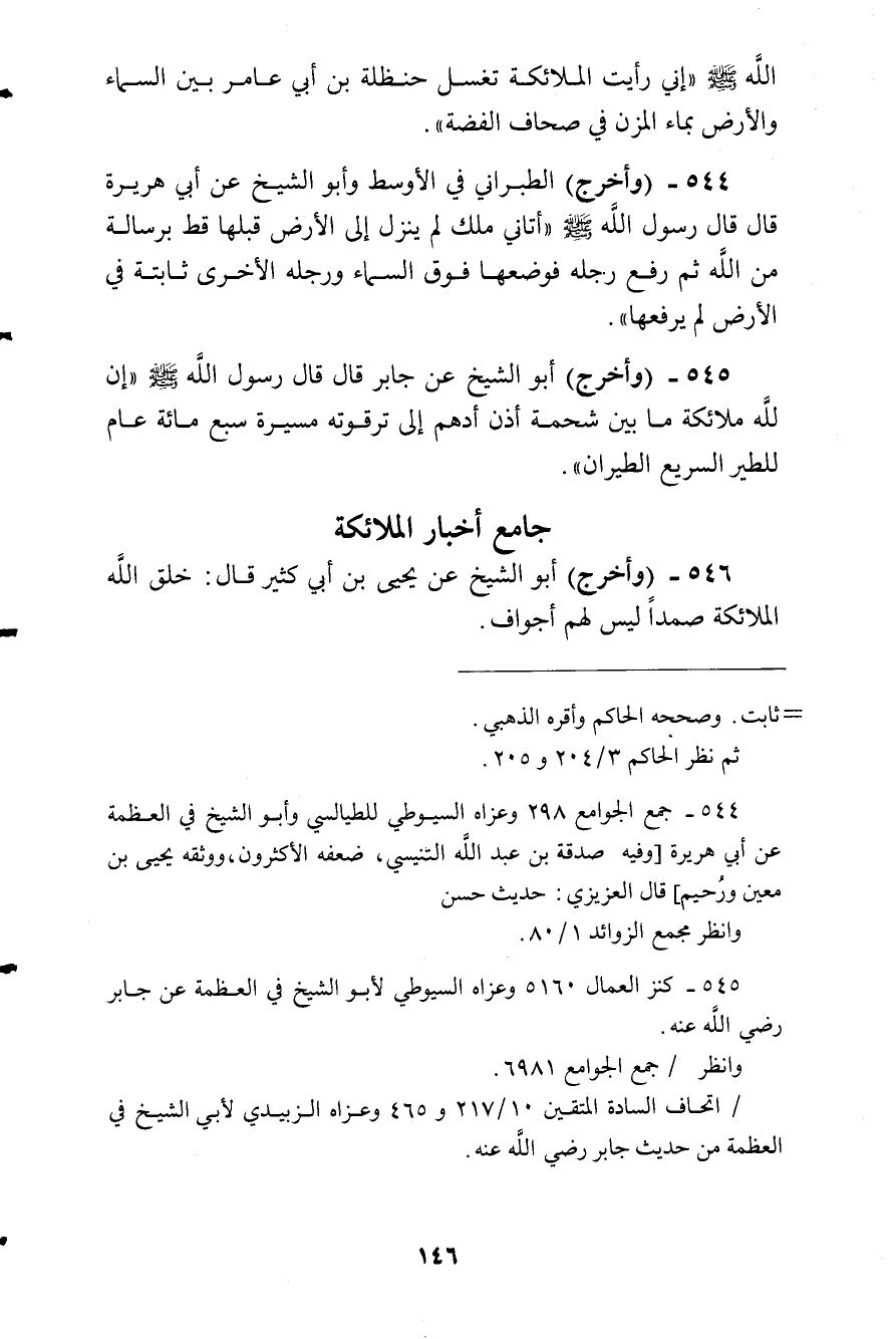 وأخرج أبو الشيخ عن جابر قال: قال رسول الله صلى الله عليه وسلم:) إن لله ملائكة ما بين شحمة أذن أحدهم إلى ترقوته مسيرة سبعمائة عام للطير السريع الطيران (.