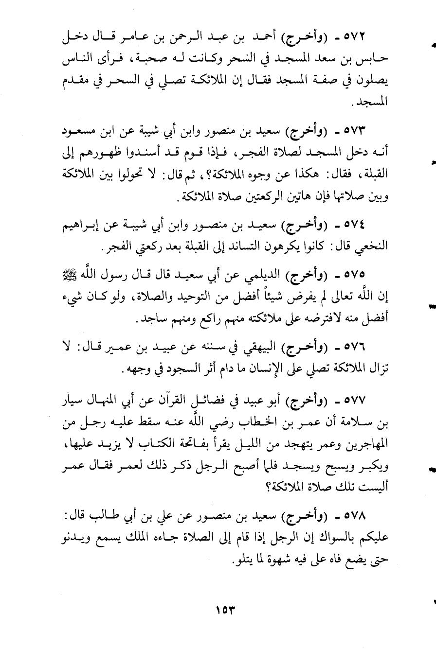 وأخرج سعيد بن منصور وابن أبي شيبة عن ابن مسعود أنه دخل المسجد لصلاة الفجر، فإذا قوم قد أسندوا ظهورهم إلى القبلة، فقال: هكذا عن وجوه الملائكة، ثم قال: لا تحولوا بين الملائكة وبين صلاتها فإن هذه الركعتين صلاة الملائكة.