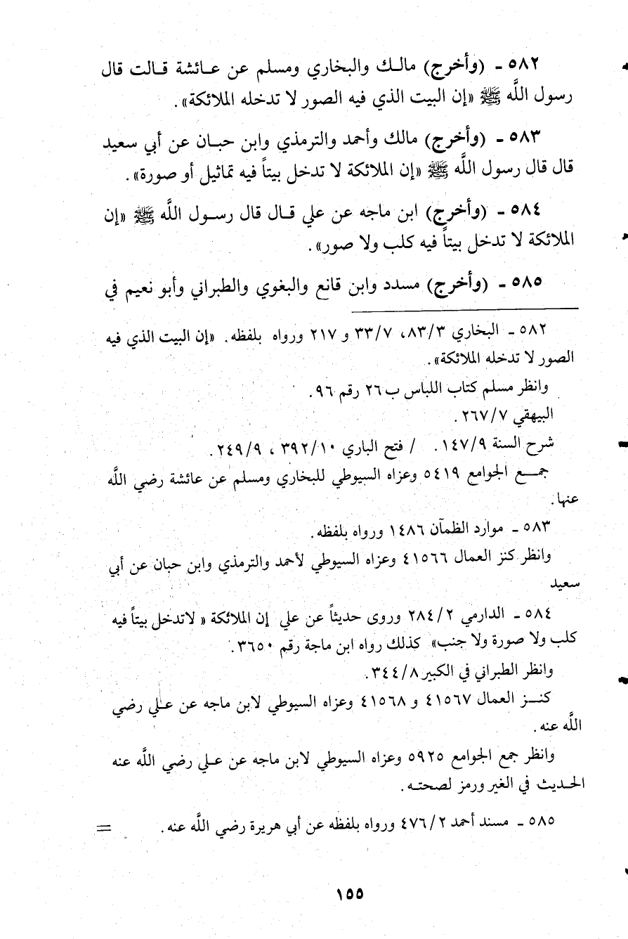 وأخرج مالك وأحمد والترمذي وابن حبان عن أبي سعيد قال: قال رسول الله صلى الله عليه وسلم:) إن الملائكة لا تدخل بيتا فيه تماثيل أو صورة (.