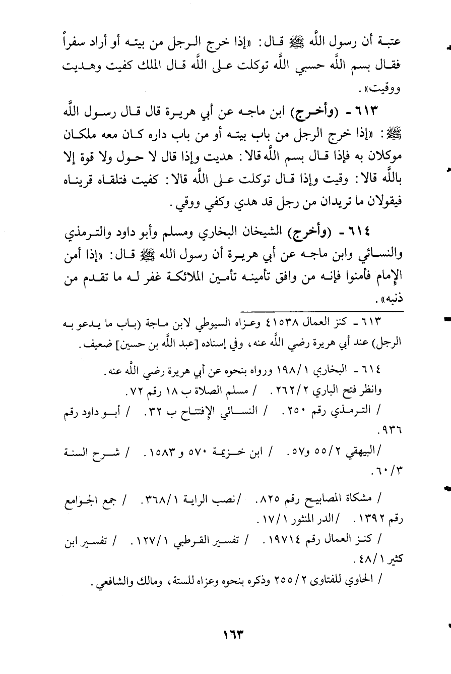 عتبة أن رسول الله صلى الله عليه وسلم قال:) إذا خرج الرجل من بيته أو أراد سفرا فقال: بسم الله، حسبي الله، توكلت على الله، قال الملك: كفيت وهديت ووقيت (.